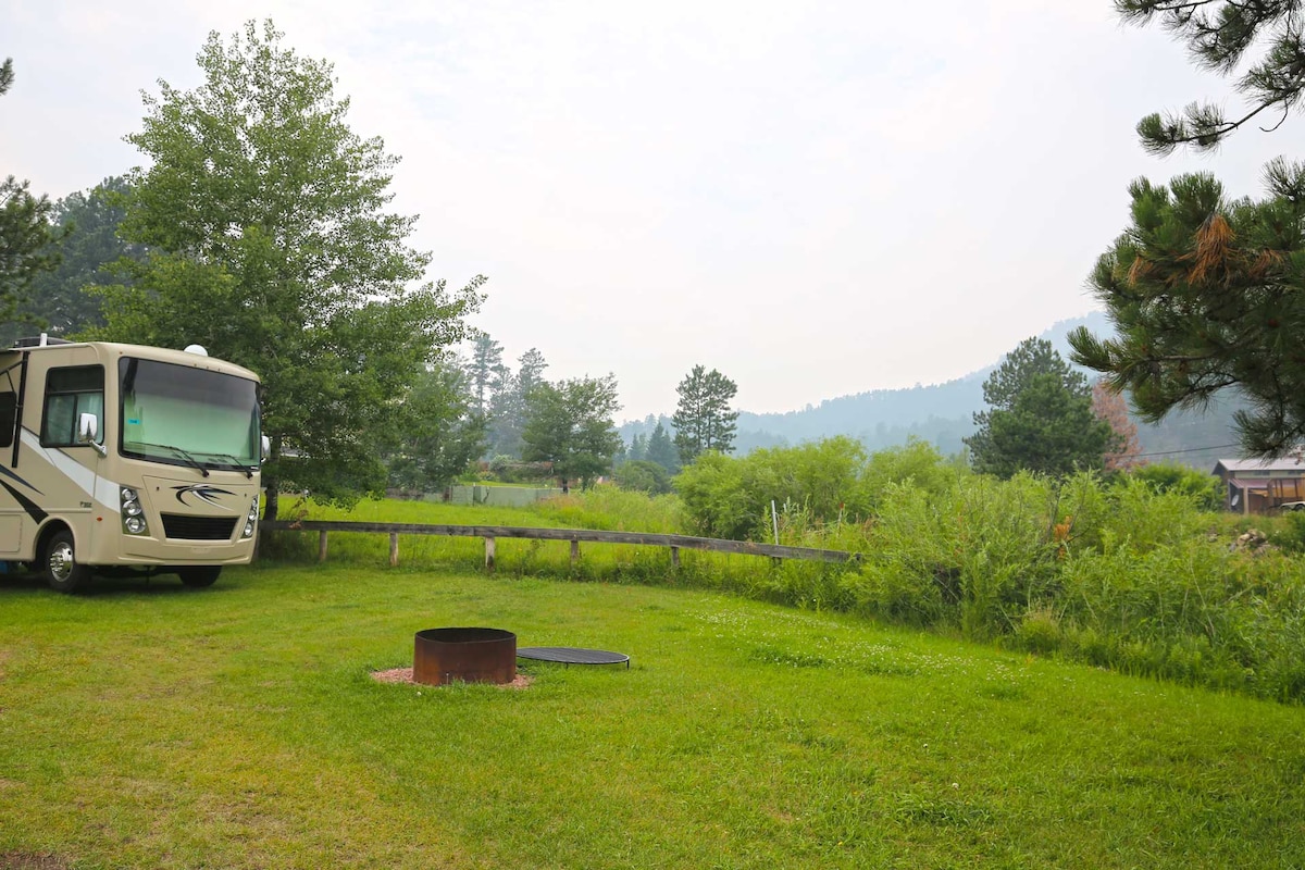 Back-In entry 65′ pad length RV space rental Power - 50A, 30A, 20A Plugs Water Sewer Garbage WiFi Leashed pets allowed Camp host on-site Fire rings, grate and picnic table at each site. Located along spring creek this is a great base for touring the area with quick access to lakes, Mickelson Trail and a 12 mile drive to Mt. Rushmore. Depending on your provider cellphone service can be weak in this area, we strongly suggest downloading offline maps before coming to the Hill City area.