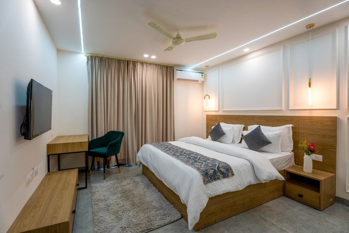 Premium 1BHK Service Apartment in Sector 43, Gurgaon s klimatsko napravo v dnevni sobi in spalnici ter kuhinjska niša z indukcijo, mikrovalovno pečico in jedilnim priborom. Na elegantnem območju, peš do nakupovalnega središča Gold Souk in šole Shalom Hills, 2,2 km od podzemne železnice Millennium City Centre in 2,1 km od bolnišnice Fortis. Tuji gostje so dobrodošli. Zgodnji prihod bo odvisen od razpoložljivosti, zaračunljivo pa je tudi 500 Rs, pozni odhod pa bo enako, če bo dodan 500 ₹ za vsake 3 ure po tem.