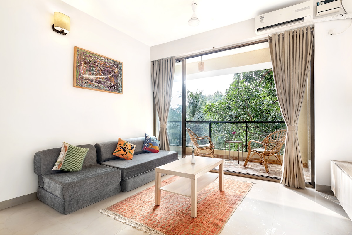 ☆ Zasebni bazen na vašem balkonu ☆ Nahaja se ob vseh večjih plažah v Severni Goi ☆ Calangute Beach 6 min 🛵 ☆ 13 min do plaže Candolim ☆ Vagator Beach 25 min ☆ Anjuna Beach 25 min ⇒ Enostaven dostop do obeh letališč ⇒ Mirna soseska, ⇒ kot nalašč za WFH. Vključuje pisalno mizo in optični WI-FI ⇒ Dovolj parkirnega prostora za avtomobile in kolesa ⇒ Za 4 odrasle osebe ⇒ Vrhunska oprema, francoski jedilni pribor, 1 zakonska postelja in 1 raztegljiv kavč ⇒ 55-palčnipametni televizor, PlayStation in Marshall zvočniki