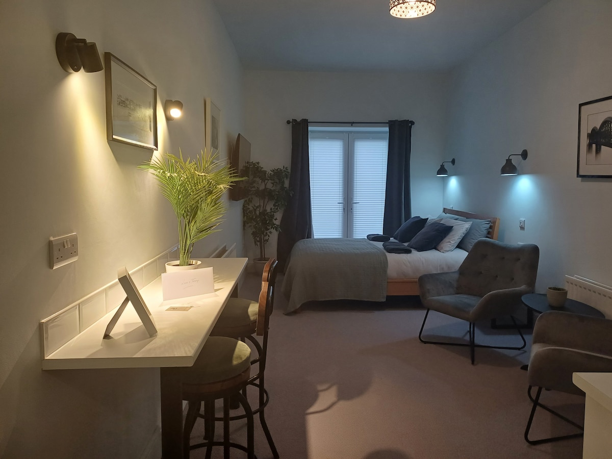 Večja spalnica, udobna zakonska postelja , kopalnica v spalnici. okno, dostop za goste po stopnicah . hladilnik , oprema za pripravo čaja /kave .Fan, ogrevanje. TV. Wi-Fi . Sprejemamo pse z dobrim vedenjem za doplačilo v višini 12 £ na noč, ki se plača ob rezervaciji. Otroci, ki jih sprejmejo samo na zahtevo , se zaračuna strošek nočitve. Preverite pred rezervacijo. Brezplačen zajtrk z žitaricami, rogljičkom , sadjem in kavo, ki sta na voljo v dnevni sobi za goste. A la carte kuhan zajtrk v spodnji kavarni/baru, od 9 do 5