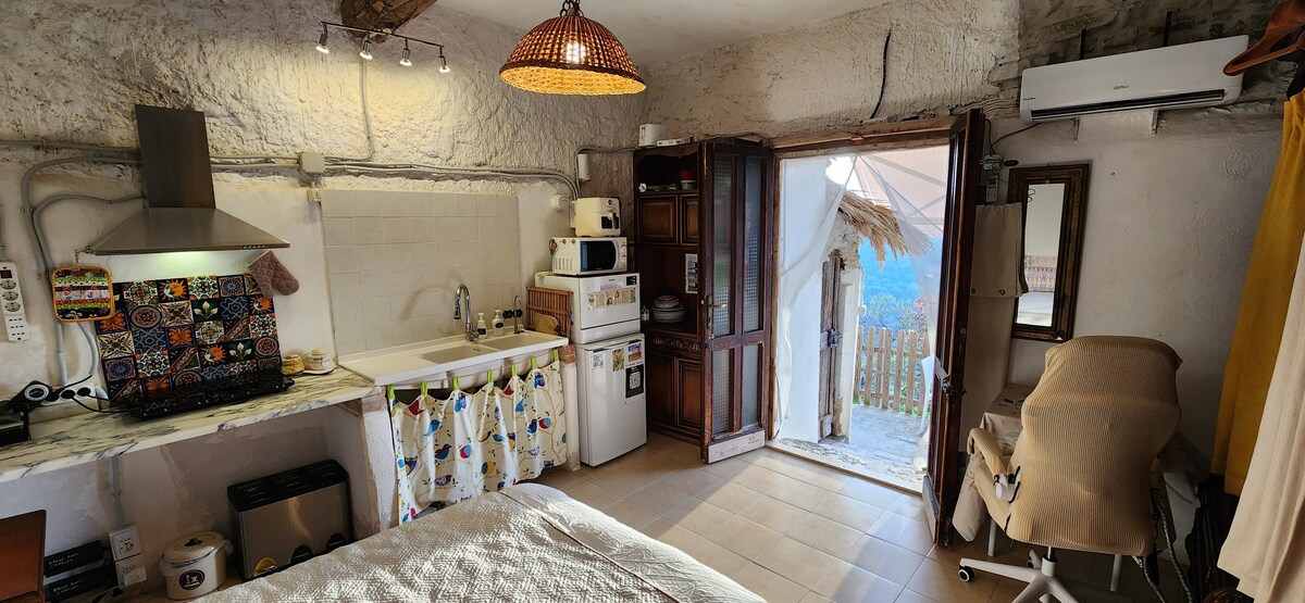 La piccola casa in grotta ha un ingresso indipendente. è una piccola camera ipogea ricavata totalmente all’interno della massa tufacea . Le grotte hanno un loro particolare microclima che viene regolato da impianto di riscaldamento in inverno e deumidificazione quando necessario. Nello spazio esterno, arredato con tavolino e sedie, è possibile incontrare e fare amicizia con la mia gattina e con il mio cane, un dolcissimo Border Collie . Soggiornare in una grotta è un esperienza.