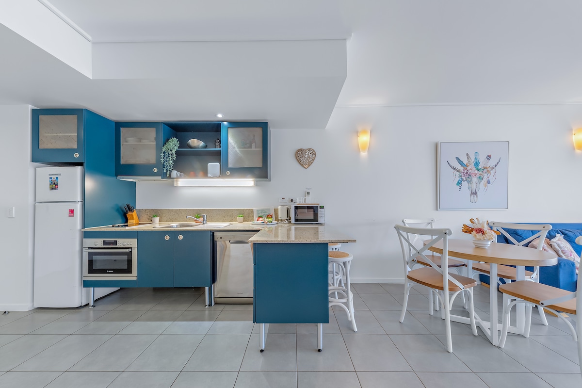 "Deja Blue" is a beautiful top floor studio apartment with stunning views of the ocean, islands and marina, from its generous balcony. This unit is nestled right in the heart of Airlie Beach, a five minute walk to the township where you will find it's restaurants, boutiques and markets. Airlie Beach is also the launch pad for activities around the Whitsunday coast on and off the water as well as around our famous Great Barrier Reef, including the magnificent islands.