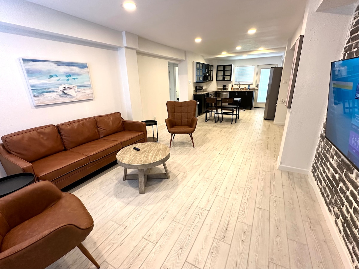 KORAKI OD PLAŽE! RAZKOŠNO imenovani v prostornem, svetlem, sodobnem slogu, smo poskrbeli, da je vsaka podrobnost popolna. Najlepši sončni vzhod, ki ga boste kdaj videli, vas vsako jutro čaka. Vsako noč čudovito sonce zaide nad Laguna Madre! Vaša nastanitev bo enako navdihujoča. Stanovanje v pritličju (brez stopnic!) je čudovito opremljeno, s prostornimi stropi visokimi 10 čevljev, LED osvetlitvijo, novim pohištvom in napravami, pametnimi televizorji v vseh sobah, ki se nahajajo na enostavni hoji do vsega. UŽIVAJTE!