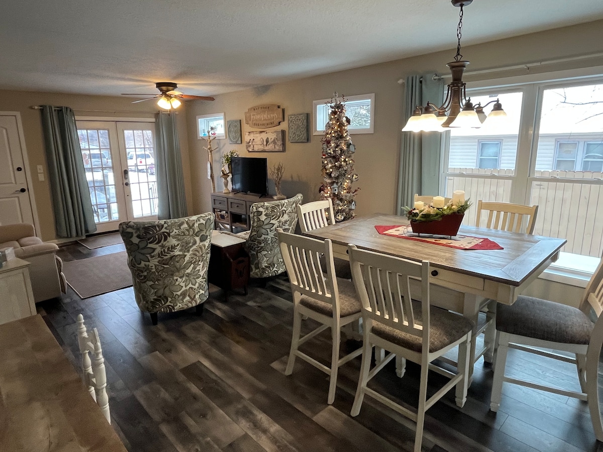 This spacious home located in a safe, quiet neighborhood features two bedrooms upstairs with king and queen beds, two rooms down with three queen beds, two family rooms, each featuring televisions with local stations and wi-fi, two bathrooms, laundry, fully furnished kitchen, three season porch, office, one car attached garage with opener. Ammenities include wi-fi, washer, dryer, dishwasher, fenced yard, outdoor gas grill, central air-conditioning, water softner and weekly house cleaning.