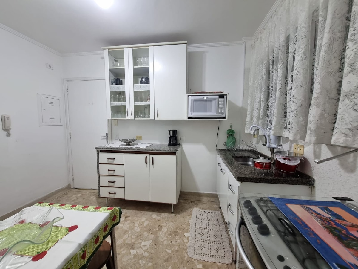 Amplo e super confortável, o apartamento de 2 quartos fica somente a duas quadras da praia, em localização privilegiada, perto do metrô, restaurantes, mercado e atrações turísticas. Tem garagem p/ carro de passeio, pequeno ou médio (1,70m). A fechadura eletrônica permite self check-in! Salas de estar e jantar, WiFi, cozinha completa, suíte com cama queen e um quarto com duas camas de solteiro (e colchão de solteiro extra) - com ar-condicionado. Banheiro social, e na suíte. Tem enxoval.