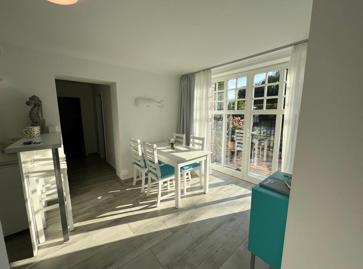 Sončno 4-sobno stanovanje z ložo na vodi z vrtom in prostorom za žar, plavanjem v Dahmeju ali sproščanjem v majhnem bazenu. V kuhinji boste našli vse, kar potrebujete za kuhanje. Kot tudi grelnik vode in aparat za kavo. V ključavnici je zakonska postelja 180 × 200. V sobi Logia sta ločeni dve enojni postelji ali pa ju je mogoče postaviti skupaj. V sobi v parku je še ena zakonska postelja 180 x 200 Kot tudi dva raztegljiva kavča, enega v dnevni sobi do vrta zunaj in enega v loži. Wi-Fi je povsod
