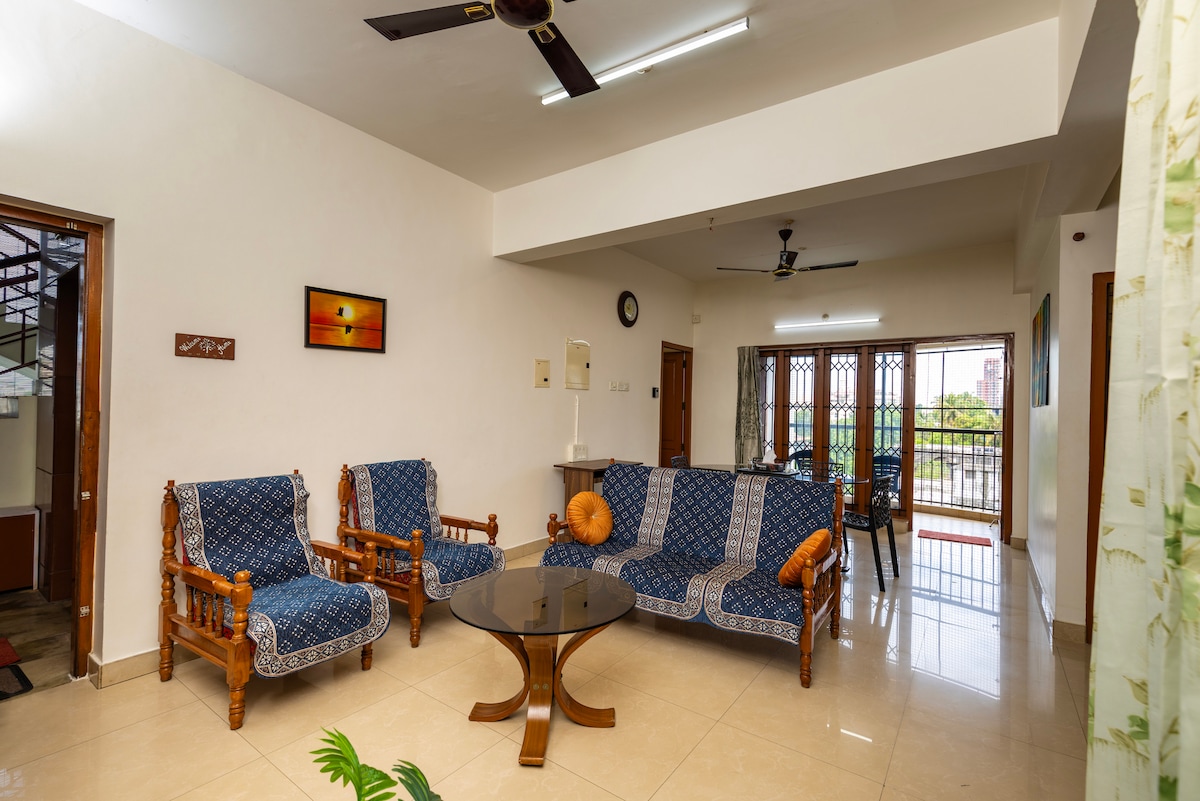V manj kot 1 km od templja Shri Padmanabhaswamy, 1,5 km od osrednjega avtobusnega postajališča in železniške postaje, 1 km od terminala 2 (mednarodno letališče), 4-5 km od terminala 1 (domače letališče) je naš miren prostor. Prostorno stanovanje 2BHK v prvem nadstropju našega prenočišča s kopalnicami, balkonom, popolnoma opremljeno kuhinjo s hladilnikom in pralnim strojem ter drugimi dodatki za udobno bivanje v mirnem okolju in kar je najpomembnejše, varen prostor za družine in ženske, ki potujejo.