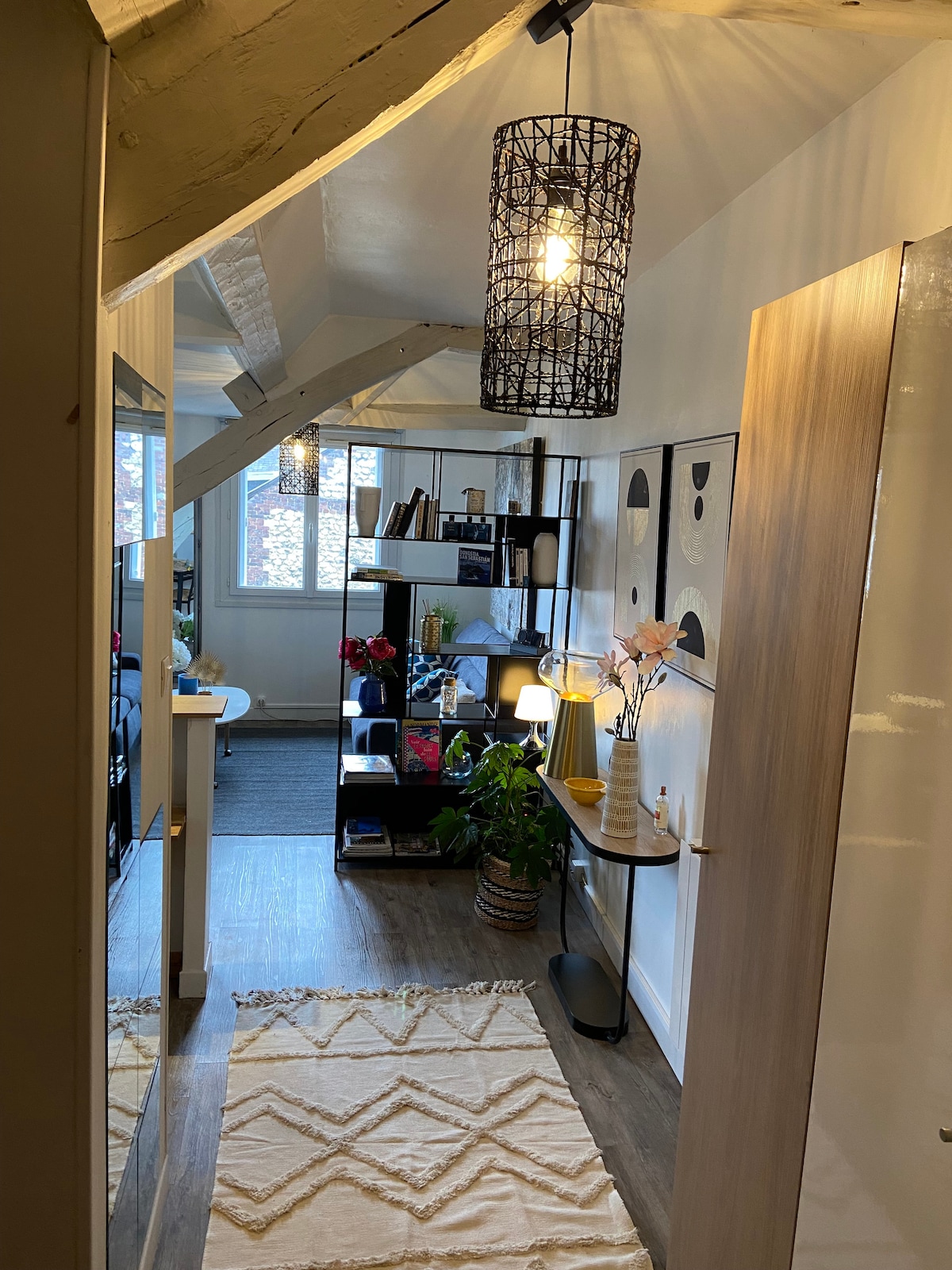 Duplex situé dans l'hypercentre, quartier Palais de justice, en dernier étage aux poutres apparentes, accueillant et douillet ! Il est situé dans une rue piétonne calme et ensoleillée. A moins de 10 min de la gare, au pied de la rue du Gros Horloge. L'appartement se situe au dernier étage d'un immeuble ancien (sans ascenseur). La chambre est en duplex. Logement éco-responsable avec pratiques écologiques : produits d'entretien écologique, bac à recyclage, cabas pour faire les courses...