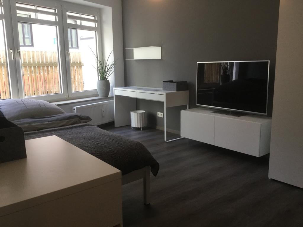 Gesamtwohnfläche 25 qm zentrale Lage Der Wohnbereich beinhaltet eine Küchenzeile mit Dunstabzug ins Freie, einen Esstisch, einen Arbeitsplatz am Fenster sowie ein Bett mit einer Breite von 1,20 m (Länge 2 m). Das Bad ist mit einer ebenerdigen Dusche ausgestattet (keine Waschmaschine integriert). Das Parkhaus am Dachauplatz ist in unmittelbarer Nähe. Weiter Stellplätze für Autos sind entlang der Straßen (kostenpflichtig). WLAN ist verfügbar.