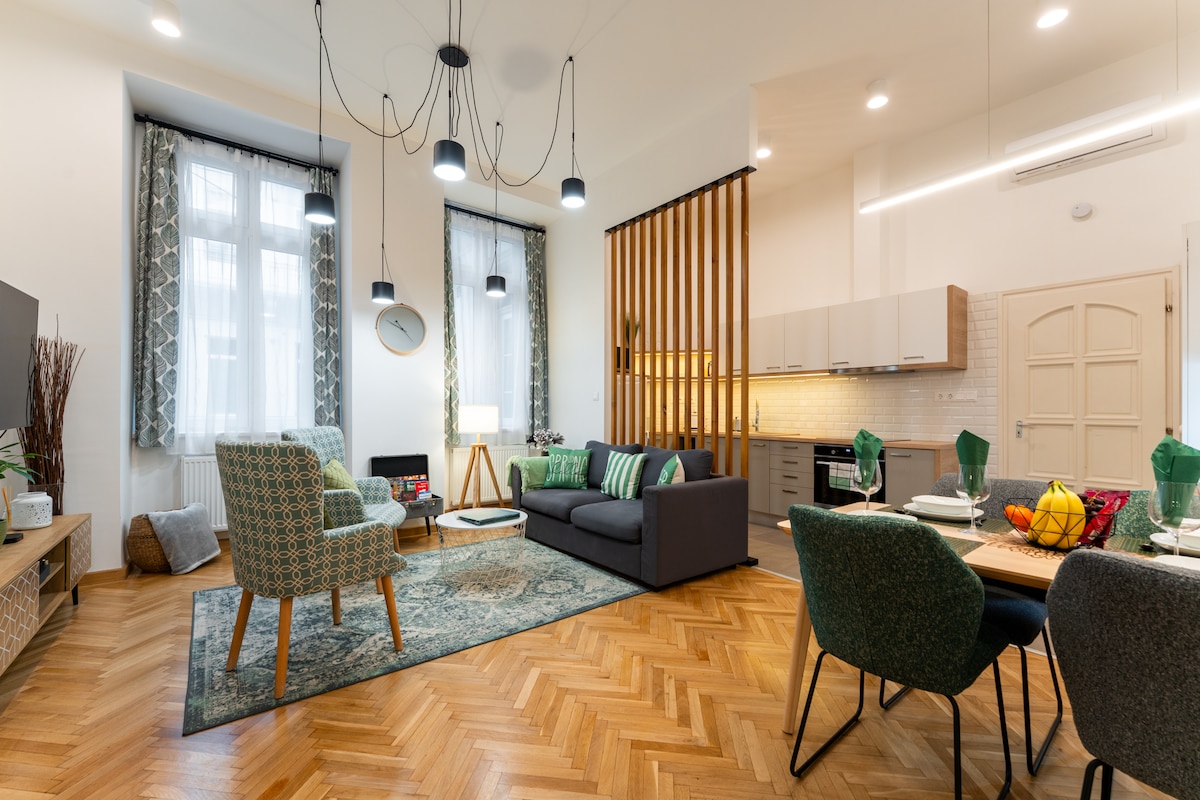 Often used as a cliche but so true here: this is a one-of-a-kind apartment in the absolute center that offers you a truly amazing Budapest stay. You can live here as a modern-day notable akin to the ones who populated these apartments like ours with their ultra-high ceilings and spacious, luxury space in the early 20th century. The heyday of Budapest and Europe when Art Deco or its contemporary rival Bauhaus was in vogue, to which this ultra high-end apartment harks back in its many elements.