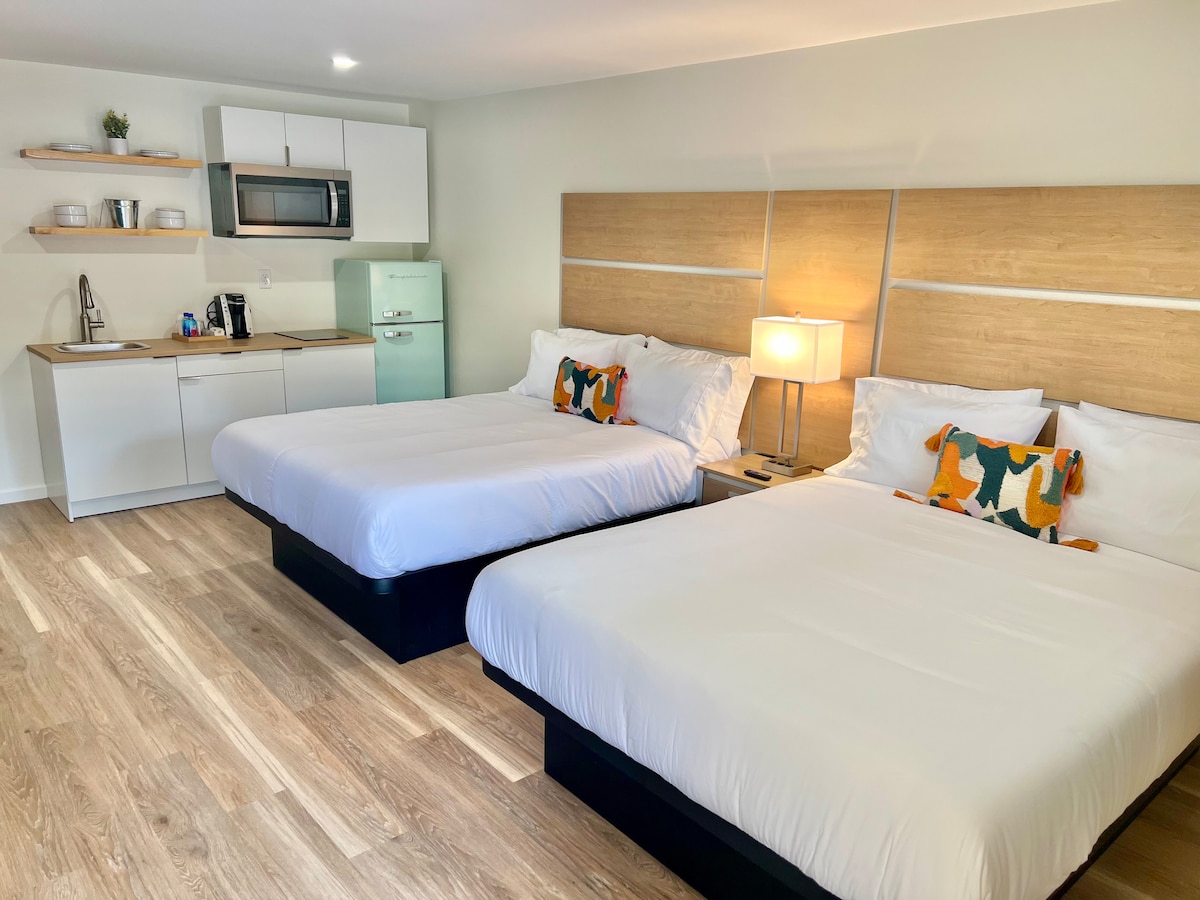 Dobrodošli v motelu Far Out, le streljaj od MSU! Stopite v eksplozijo preteklosti z našimi retro navdihnjenimi sobami, prenovljenimi s sodobnim pridihom za vaše največje udobje. Uživajte v naši elegantni zunanji terasi in bivalnem prostoru, ki sta kot nalašč za sprostitev ali druženje po celodnevnem raziskovanju. Nahaja se na priročni lokaciji v središču mesta, na pragu pa boste imeli najboljše od restavracij in nočnega življenja v Starkvillu. Ta soba ima 2 spalnici: Spalnica 1 - dve zakonski postelji Spalnica z 2 zakonskima posteljama in kuhinjo