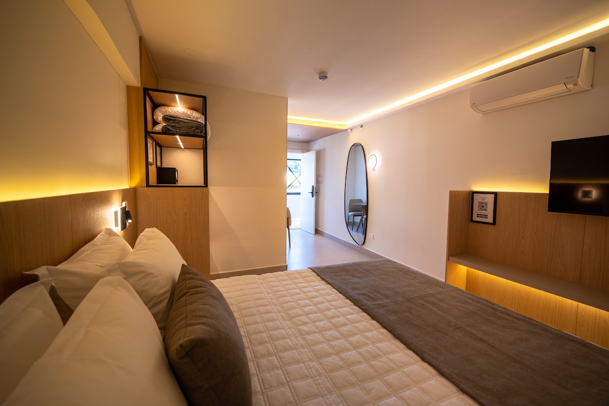 Café da manhã, Wifi, carregador de carro elétrico cortesia na hospedagem Taxa de turismo: R$ 3,00/diária ISS 3% incluso Diária por pet R$129,00 Estacionamento - R$ 30 por dia Quarto com decoração moderna equipado com: Ar condicionado quente e frio SmartTV led 32” Telefone Frigobar Caixa de som bluetooth JBL Camas box solteiro Espelho de corpo inteiro Ampla janela com blackout duplo Enxoval de primeira linha Ducha com aquecimento central Ducha higiênica Secador Amenities biodegradáveis
