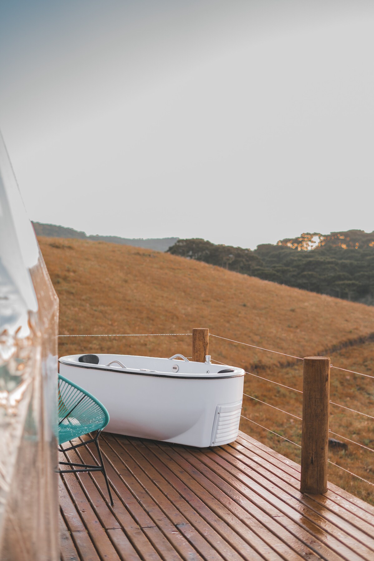 Banheira com espuma e vista verde, deck privativo e lareira interna - um domo feito para casais que buscam romance e silêncio aos pés dos canyons. Pacotes de decoração e passeios são opcionais. Localizado em Praia Grande – SC, na Capital dos Cânions e dos Balões, este domo oferece uma vista privilegiada para as montanhas e o som suave da cachoeira como trilha sonora da sua estadia.