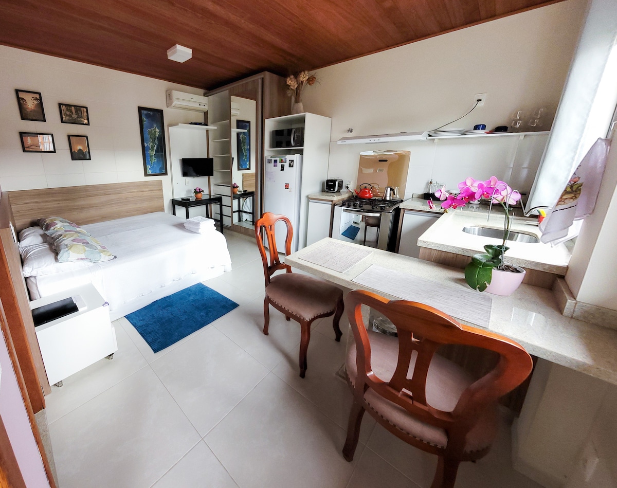 Comfortable and cozy studio in a residential area, very well located. It's close to UFSC and UDESC, and 9km from downtown. A quiet and calm place, where you can have a good night of sleep. There is also an outside area where you can relax, have a coffee and a sun bath, together with our loving Golden Retriever. You are gonna love it! You will have a full kitchen, a double bed, shower with hot water, wardrobe, ar conditioning, Wi-Fi, cable TV, bed linen, blankets, towels and heater.