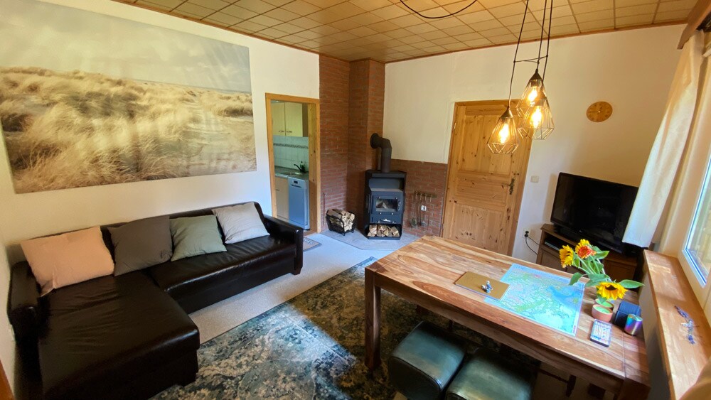 Willkommen in unserem traumhaften und ruhigen Feriendomizil - nur 4km von der Ostsee entfernt. Mitten in unserem wunderbaren Obstgarten steht unser geräumiges Haus mit einer gemütlichen Wohnküche, in der bei kaltem Wetter ein Kaminofen für Gemütlichkeit sorgt. Im Sommer lädt die große Terrasse mit einem schattenspendenden Apfelbaum zum gemeinsamen Essen ein. Im liebevoll ausgebauten Nebenhaus befindet sich eine Sauna mit Bad und Dusche und einem idyllischen Ruhebereich mit Aussendusche.