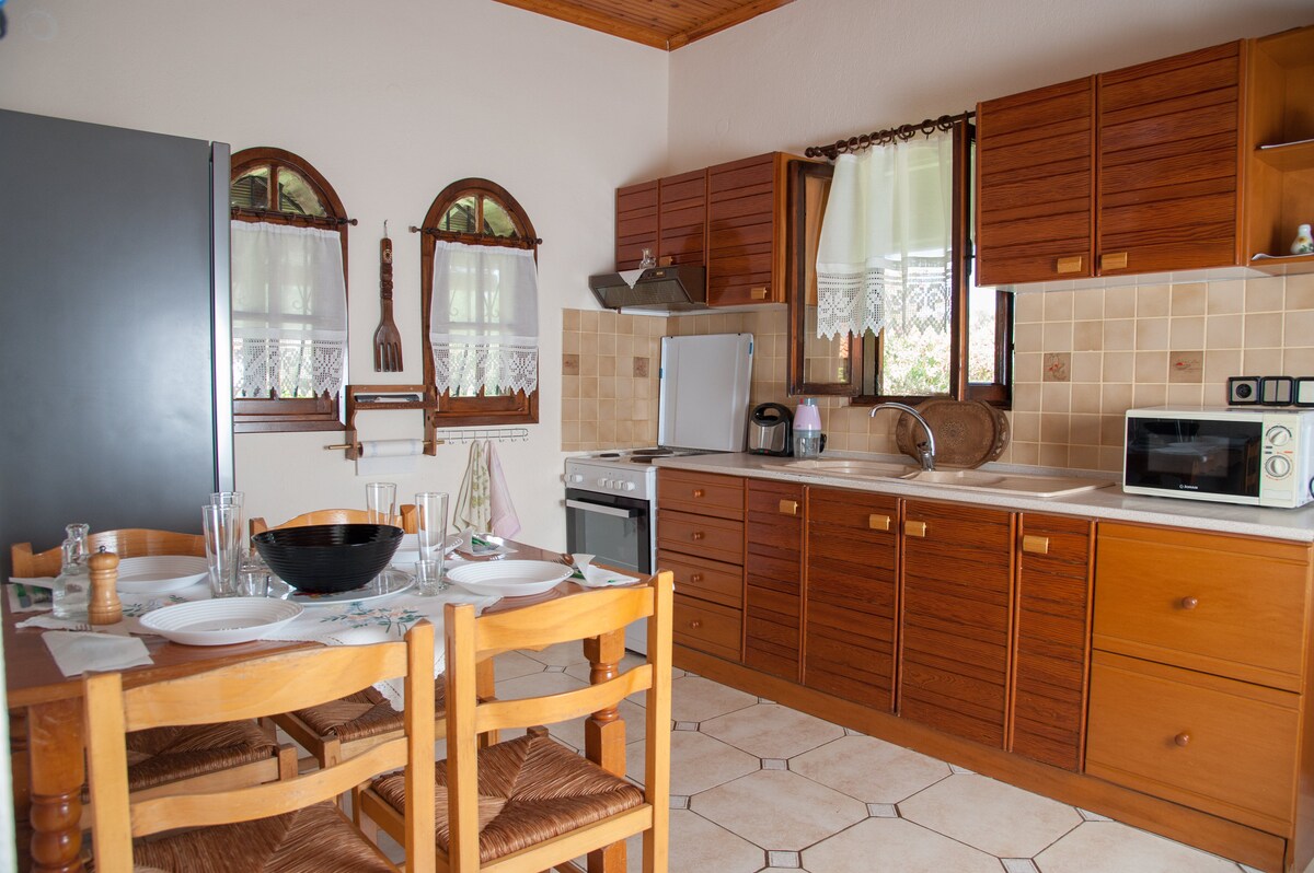 Naša hiša je velika 105 m2 in ima tri spalnice, od katerih je ena podstrešje z zakonsko posteljo. Ima popolnoma opremljeno kuhinjo in pralni stroj ter 850 m2 velik vrt z žarom. Plaža Toroni je lahko dostopna in je oddaljena 300 m.