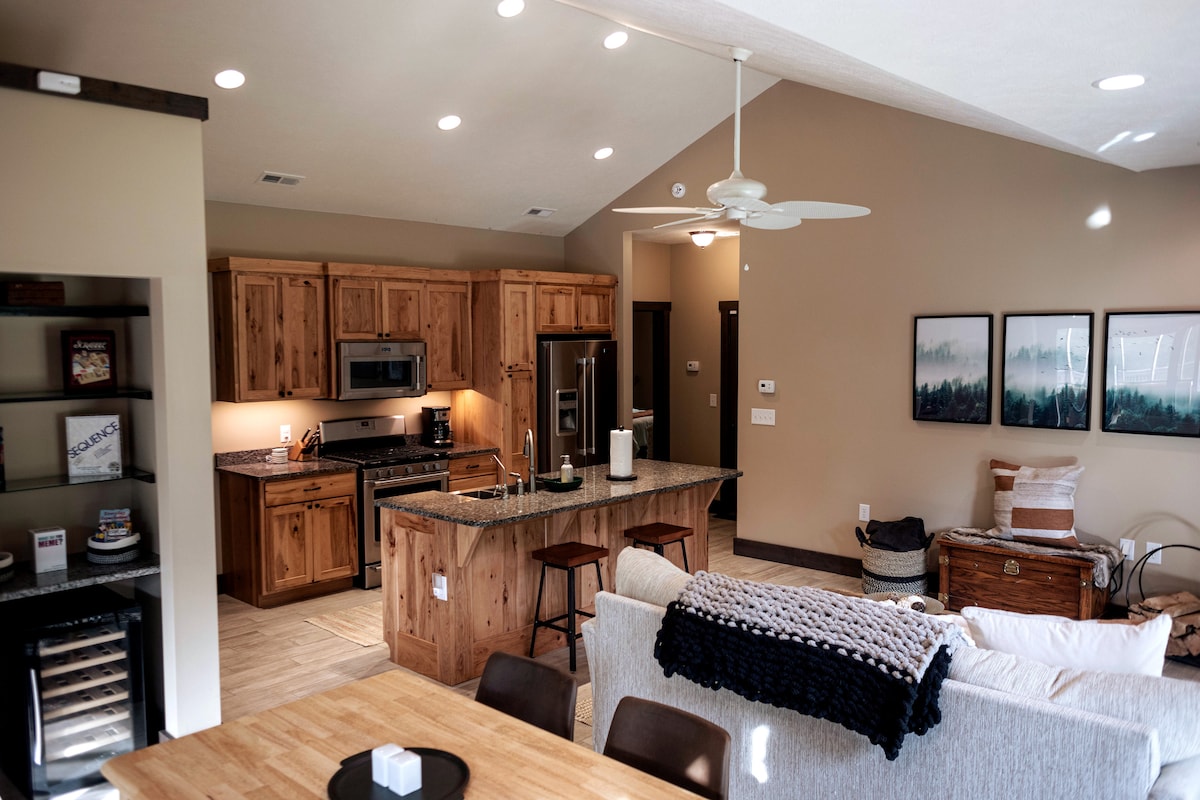 Dobrodošli v soseski Plāhaus, sodobnem prenočišču, ki se nahaja v gozdu okrožja Brown County. Plāhaus je prostor samote in sprostitve za vse, ki želijo uživati v lepoti okrožja Brown County, brez običajne dekoracije koče. Uživajte v čudovitem razgledu z balkona, preživite nekaj časa ob ognjišču in se podajte v Nashville, da si ogledate edinstvene trgovine in restavracije. Pridite na družinski oddih, romantično zatočišče ali pa se preprosto umaknite od vsakdanjega stresa.