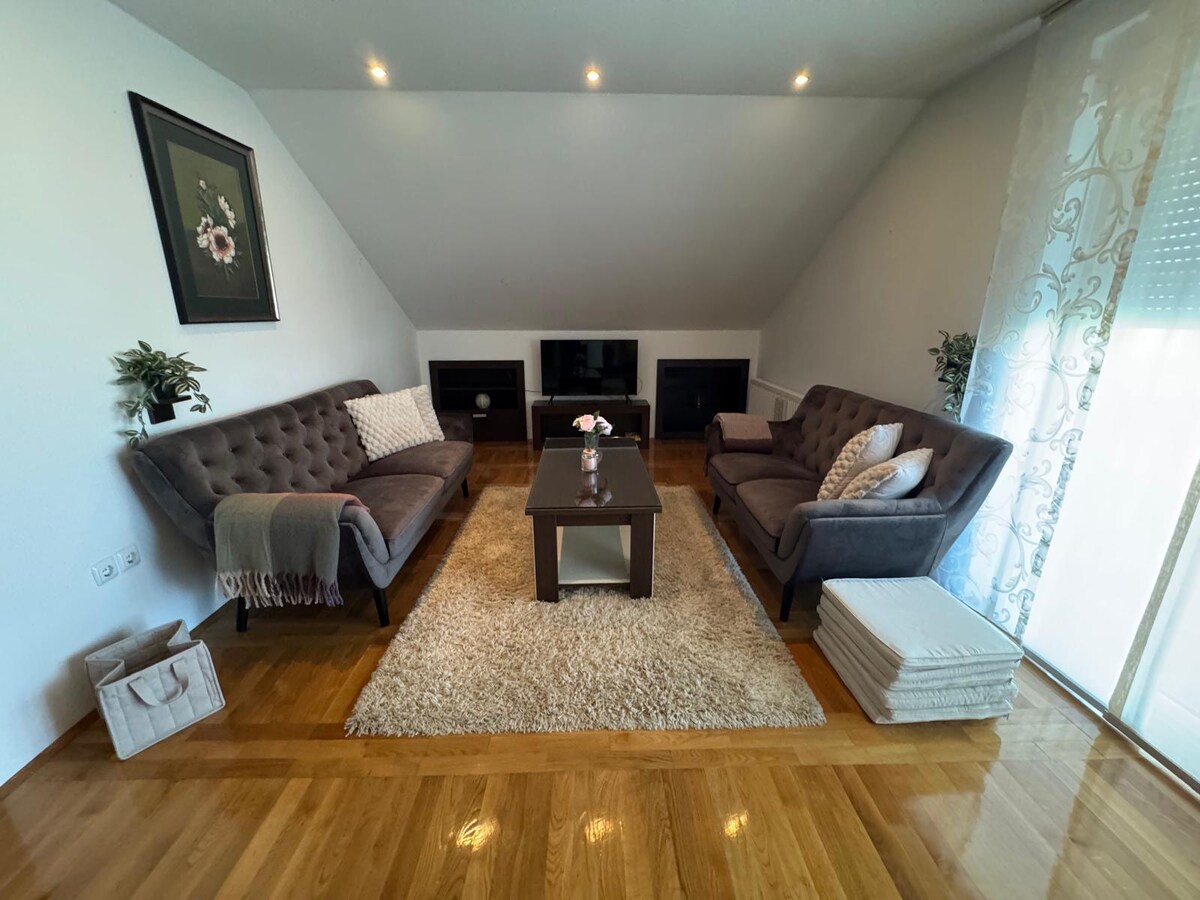 Apartman nalazi se u samom centru grada pored Strossmayerovog parka i Katedrale! Apartman se sastoji od sobe za spavanje dvokrevetni lezaj uz mogucnost koristenja pomocnog lezaja. Konforne dnevne sobe s lezajem na razvlacenje te potpuno opremljene kuhinje, prostora za blagovanje, kupaonice s vesmasinom i pred prostorom. Apartman ima malu terasicu, parkirno mjesto i Wifi.