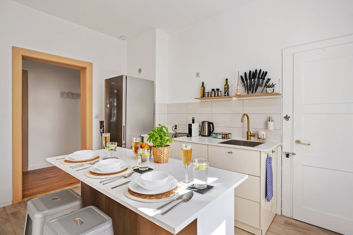 Equipped with a complete kitchen, comfortable bed (queen) and convertible sofa, a spacious bath and terrace, the studio invites you to spend lovely days in central Cottbus. It is ideal for two persons or a couple with baby or toddler . We have special provisions for kids on request such as cot or high chair.