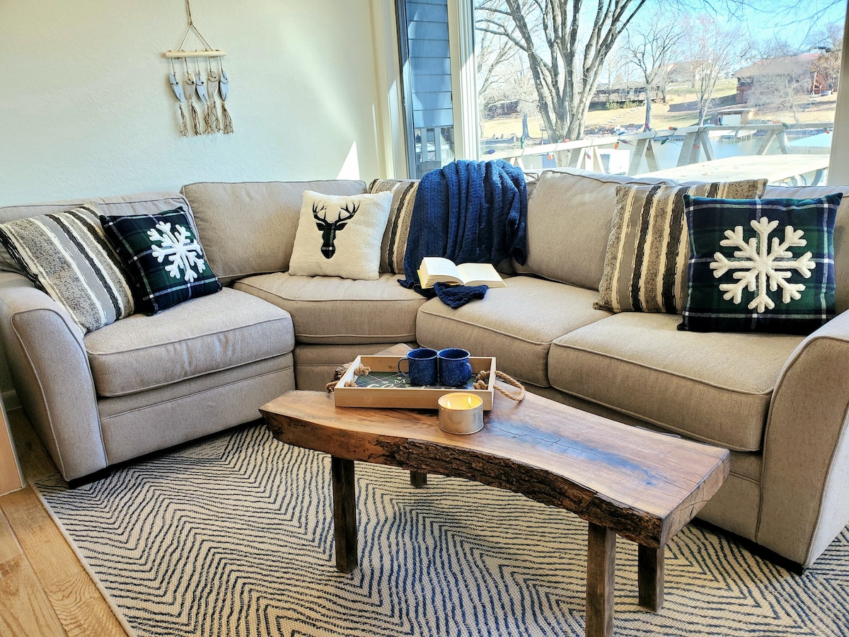Grove Getaway je bil est. leta 2020. Pridite in uživajte v celoletnem življenju ob jezeru z ognjiščem ob obali, gugalnico na drevesu, visečo mrežo in pomolom ter 3 sobami, 2 kopalnicama in 2 udobnima prostoroma. Čudovit bivalni in kuhinjski reno s čudovitim razgledom na jezero ob prihodu osvaja goste. Plinski kamin ogreje družinsko sobo, grelnik vode brez rezervoarja pa je OGREVAN! WI-FI, ROKU TV, tipkovnica, karaoke aparat, družabne igre in igrače, vsi gostje zabavajo. Za bolj prilagodljive možnosti odpovedi zaradi bolezni COVID-19 se obrnite na nas.