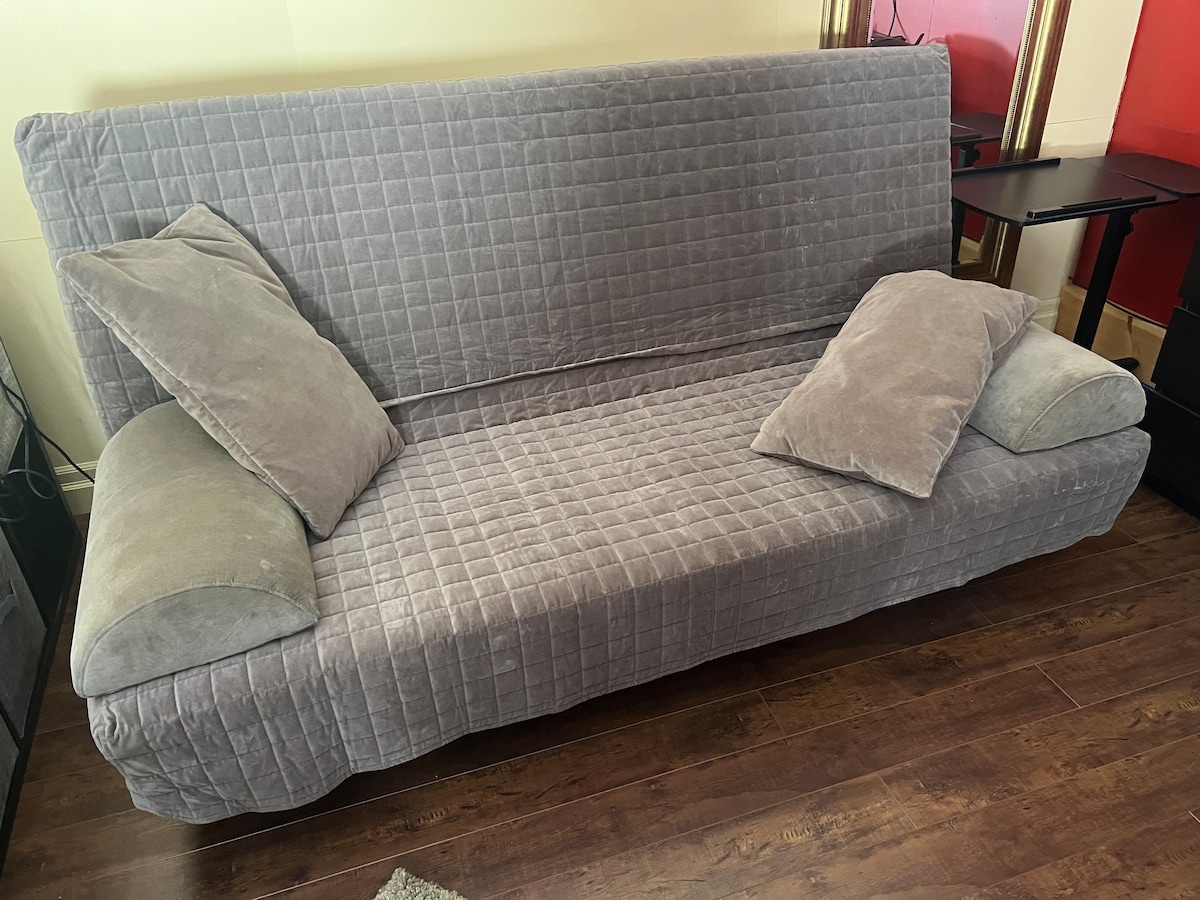 Welcome to our centrally located private unit. Big windows to brighten the fully stocked kitchen, an entertainment space with a 55” smart tv, board games, record player, a comfortable bedroom with a Queen bed & AC unit, and large bathroom. Enjoy the private outdoor area beside your personal parking spot. Kitchen includes: - Toaster - Keurig Coffee Machine + Reusable Cups - Stove - Kettle - Pots and pans - Utensils and other kitchen ware - Microwave - Mini Fridge with a freezer compartment
