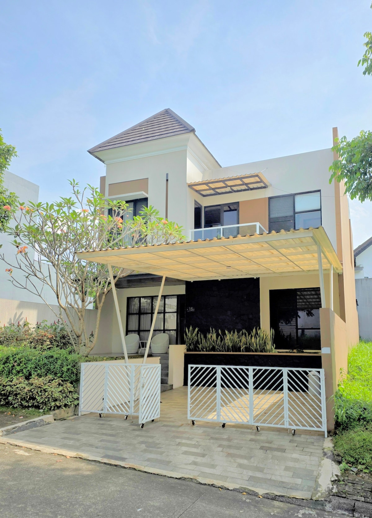»Dobrodošli v naši osupljivi luksuzni vili v Sentul Cityju. Ta čudovito oblikovana vila združuje tradicionalno leseno arhitekturo s sodobnimi detajli in ustvarja edinstveno in očarljivo vzdušje.« S tremi prostornimi spalnicami, velikodušno dnevno sobo in NESKONČNIM BAZENOM, za katerega se zdi, da se razteza v osupljivem razgledu na goro Salak, se vsako jutro plavanje zdi kot obred. Ta neverjetna namestitev ponuja mirno in spokojno vzdušje. [NE V PUNCAKU]