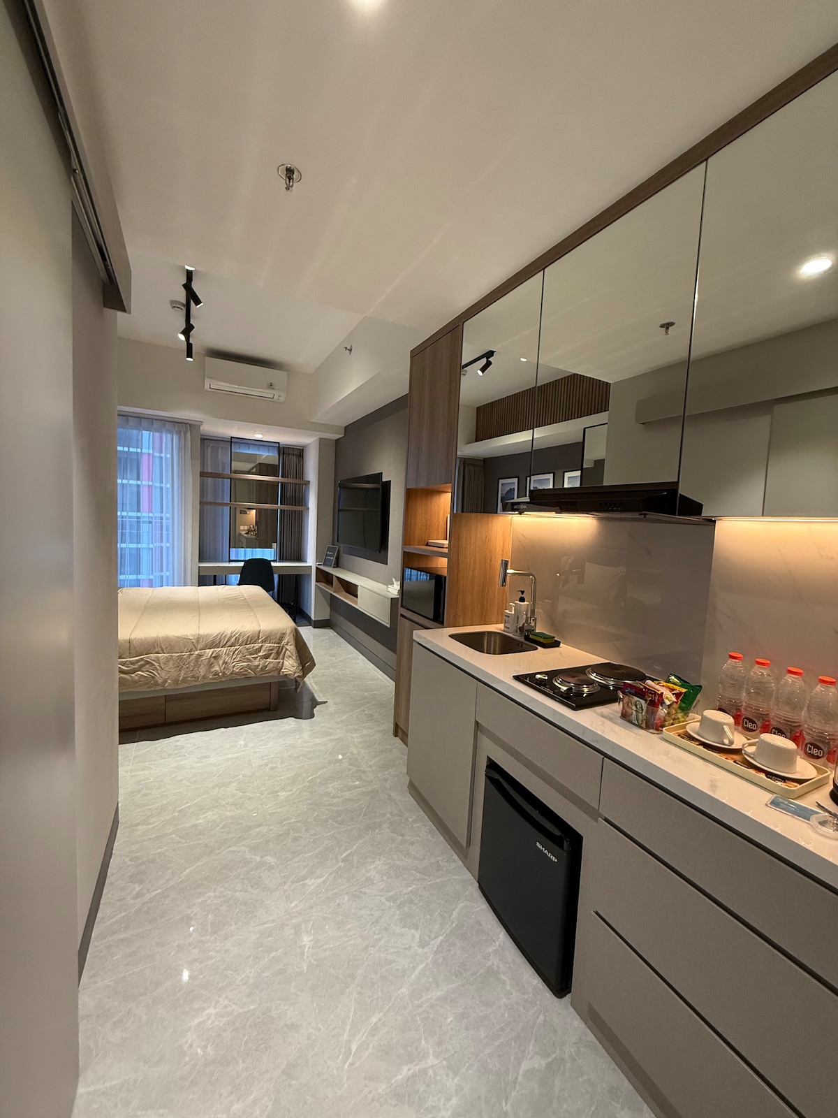 Naš studio se nahaja v stanovanju Amor tik nad mestnim nakupovalnim središčem Pakuwon. Uživajte v tem mirnem sodobnem garsonjerju z osupljivim razgledom na neskončni bazen. Zasnovan je v pomirjujočih sivih in srebrnih tonih, zato je kot nalašč za počitnice, poslovna potovanja ter kratka ali daljša bivanja. Z odlično varnostjo in široko izbiro različnih restavracij bo vaše bivanje v Surabaji še prijetnejše.