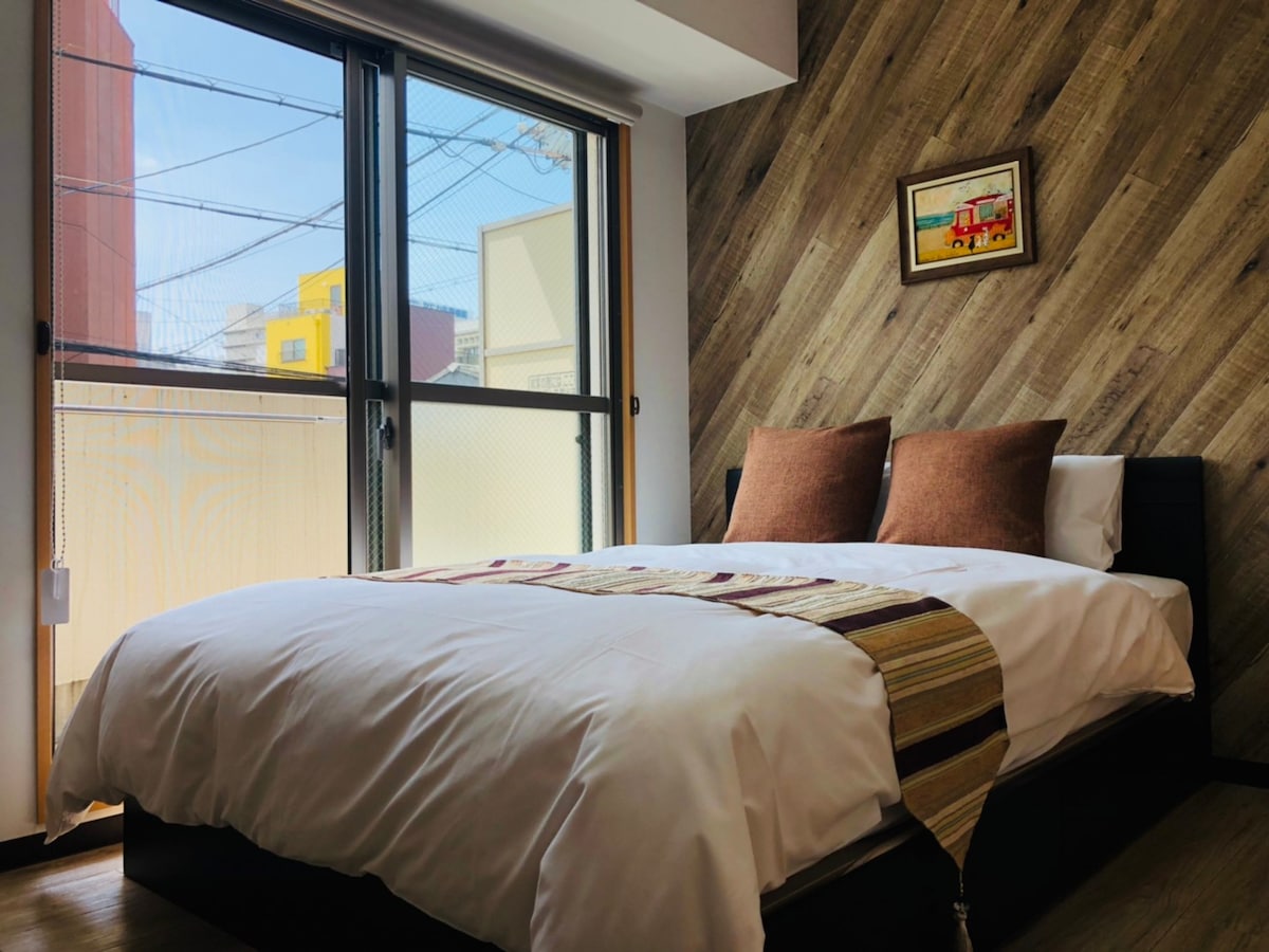 道顿堀旁的安静住宅区 ,可住6人,5分走到日本桥,黑门市场,8分走到心斋桥,近地铁站,新楼,机场直达