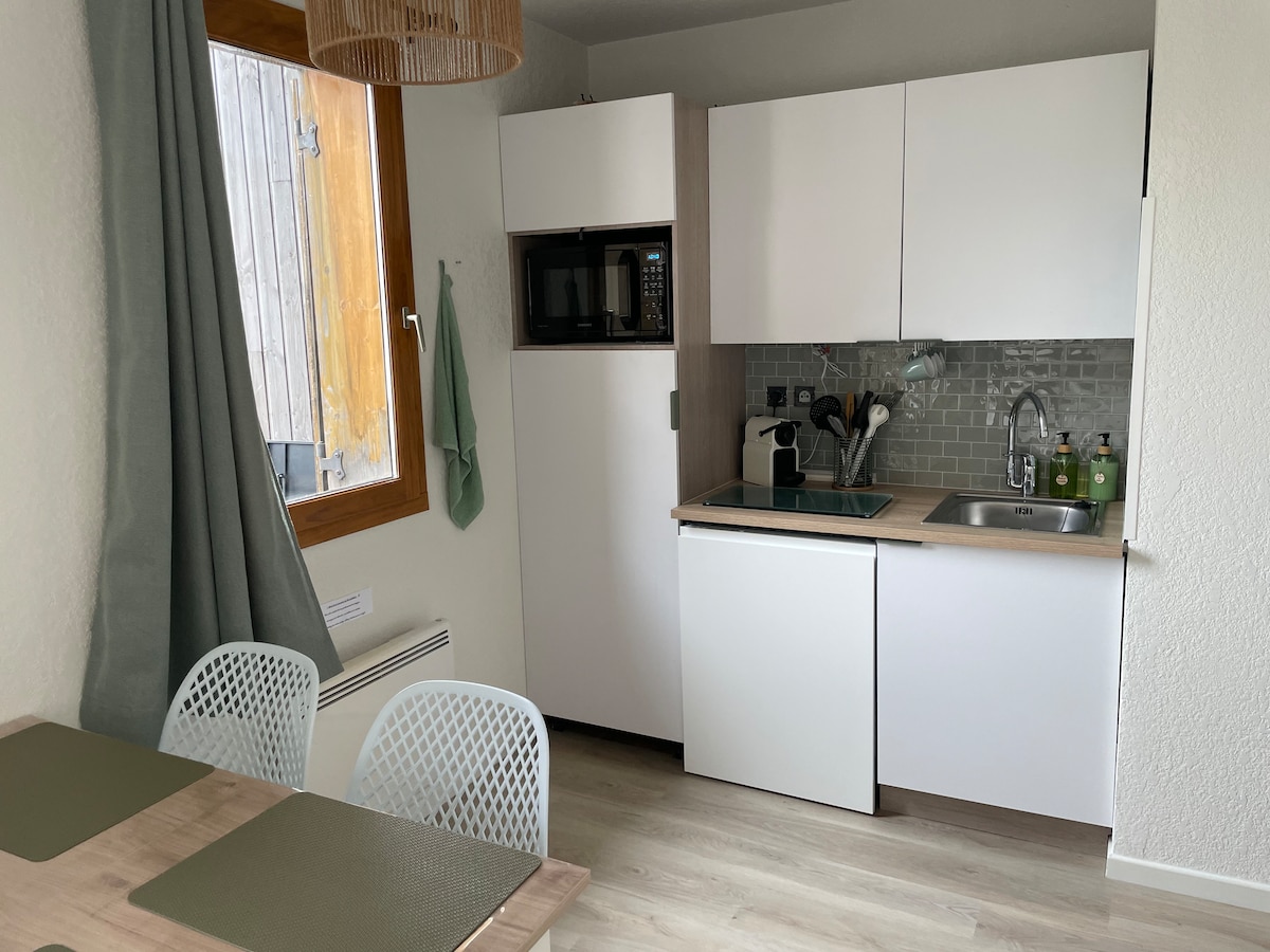 Centre Station on the 1st floor of the residence "les cîmes", premium location for access to shops and skiing. To 26 m2 veliko stanovanje z balkonom je sestavljeno iz majhne zaprte spalnice s posteljo 140 cm in 1 90 cm nad njo. Ima dnevno sobo z raztegljivim kavčem (2 osebi) ter odprto in opremljeno kuhinjo. Kopalnica je opremljena s prho. Stanovanje ima smučarsko sobo v pritličju in podzemno parkirno mesto v sosednji rezidenci »Le Paillaret«