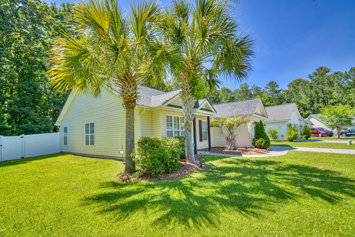 Charming 5-star home; WELCOME SNOWBIRDS SEPT-APRIL 45% discount. Huntington Beach (FREE pass) and Brookgreen just 5 mins away! Back yard oasis w/in-ground pool (seasonal) 9’ ceilings, hardwoods/rugs. Airy but cozy. 2160 sf & 2 living areas - one level. Bedrooms: 1 K BR w en suite; 2 Q BRs w shared full double-vanity BA. Fully-equipped K w island. Quiet country lane yet 5 mins. to restaurants & shops of Marshwalk. Relax on porch w rockers and swing. No motorcycles. Yes to 35 lb dogs (max 2)