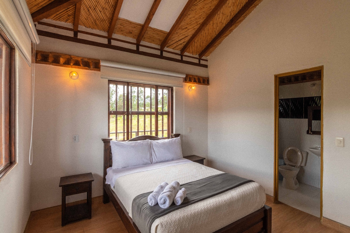 10 🌿 km od trga Plaza de Villa de Leyva (15 min🚗) in se strateško nahaja v bližini glavnih turističnih znamenitosti regije. Vaša soba vključuje: 🛏️ 1 zakonska postelja (Queen), odlična za pare. 🚽 Zasebna kopalnica z vročo vodo. 🍃 Dostop do terase s pogledom na gore 🛜 Dostop do omrežja Wi-Fi in televizije. 🧻 Brisače in oprema za udobno bivanje. 🍳 Vključuje ameriški zajtrk (jajca po okusu, topla pijača, hladna pijača, kruh ali arepa in porcijo sadja).