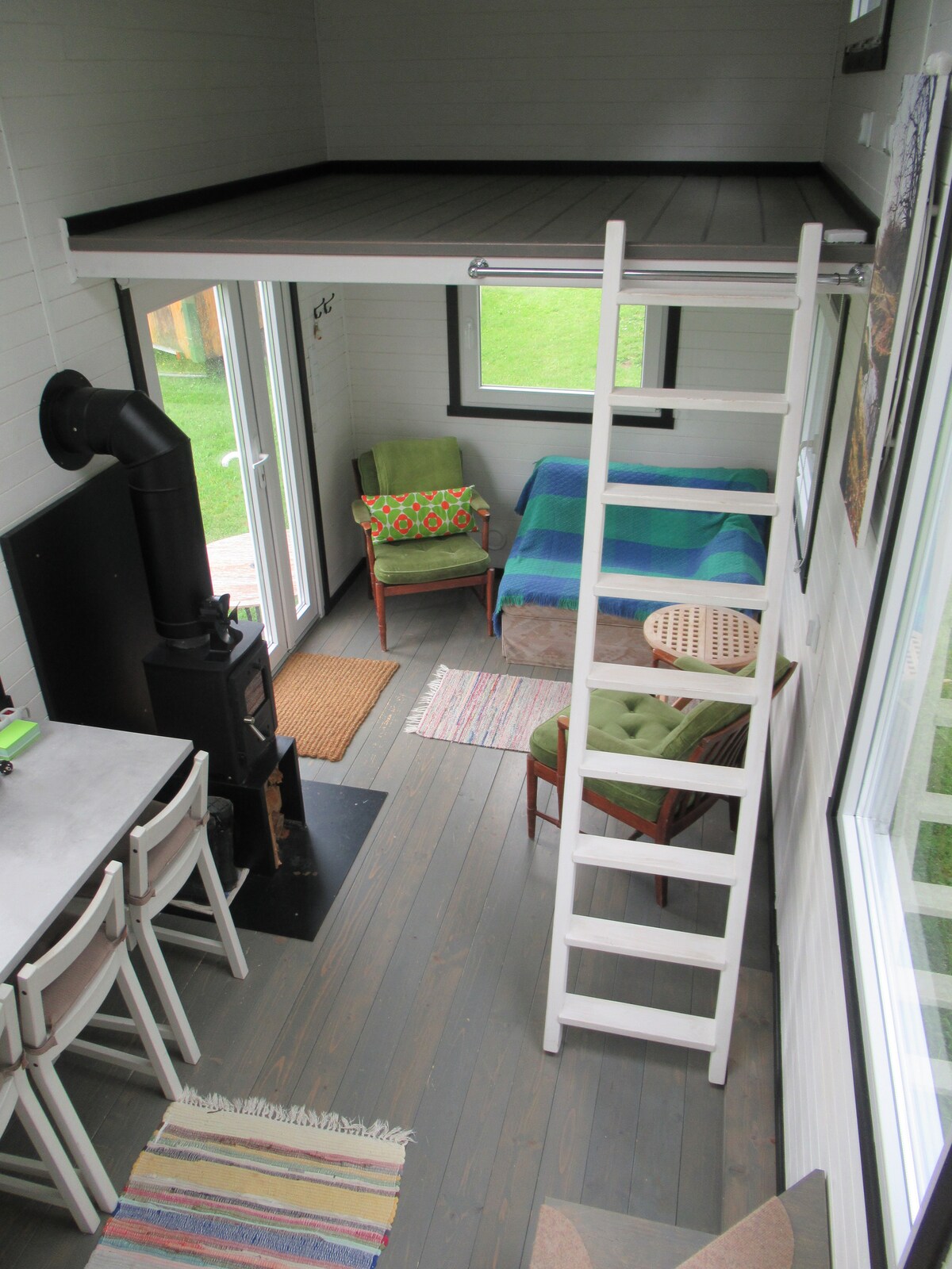 A small apartment for 2 people (travel cot for children under 2 can be arranged). Toilet and sink are inside the apartment and the shower is (Finally ready) in the house/Boden. You can also try the outdoor shower in the summer in our backyard. Now there is a kitchen with sink and fan and induction hob with 2 plates, but unfortunately no oven yet.
