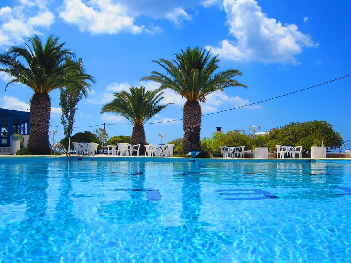 Belo pobeljeno prenočišče na hribu, Otoški pridih in sodoben občutek. Wi-Fi deluje brez zamika, Hladen zrak bo pregnal vročino. Povzpnite se po šestdesetih stopnicah, noge vas bodo morda pekle, Vendar pa boste za to prejeli 180 ogledov. Če pa postanete žejni, ne hodite predaleč Spodaj vas čaka olajšanje: bar! Za pristno grško doživetje