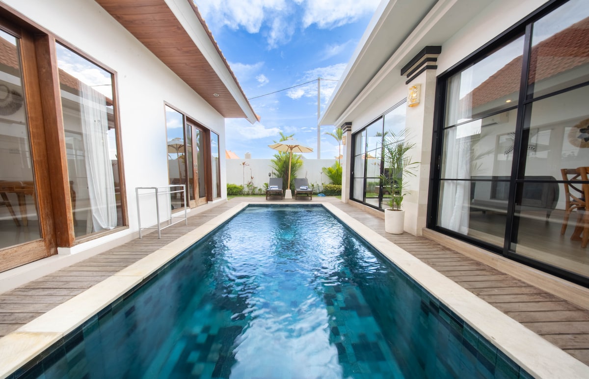 To vilo smo zgradili za našo štiričlansko deskarsko družino. Zaključek gradnje: oktober 2025. Popolnoma novo! Vključujemo dnevno čiščenje in 1 brezplačen prevoz do letališča (z več kot 6 nočitvami). Sprehodite se do plaže in vsega, kar ponuja Kedungu. Primerno za Canggu, Tanah Lot in vsa območja Balija. Najboljše območje, da se izognete prometu in hrupu. Na zahtevo so na voljo tudi otroška posteljica, kopalna kad za dojenčke, otroški stol za hranjenje in ograjo za bazen.