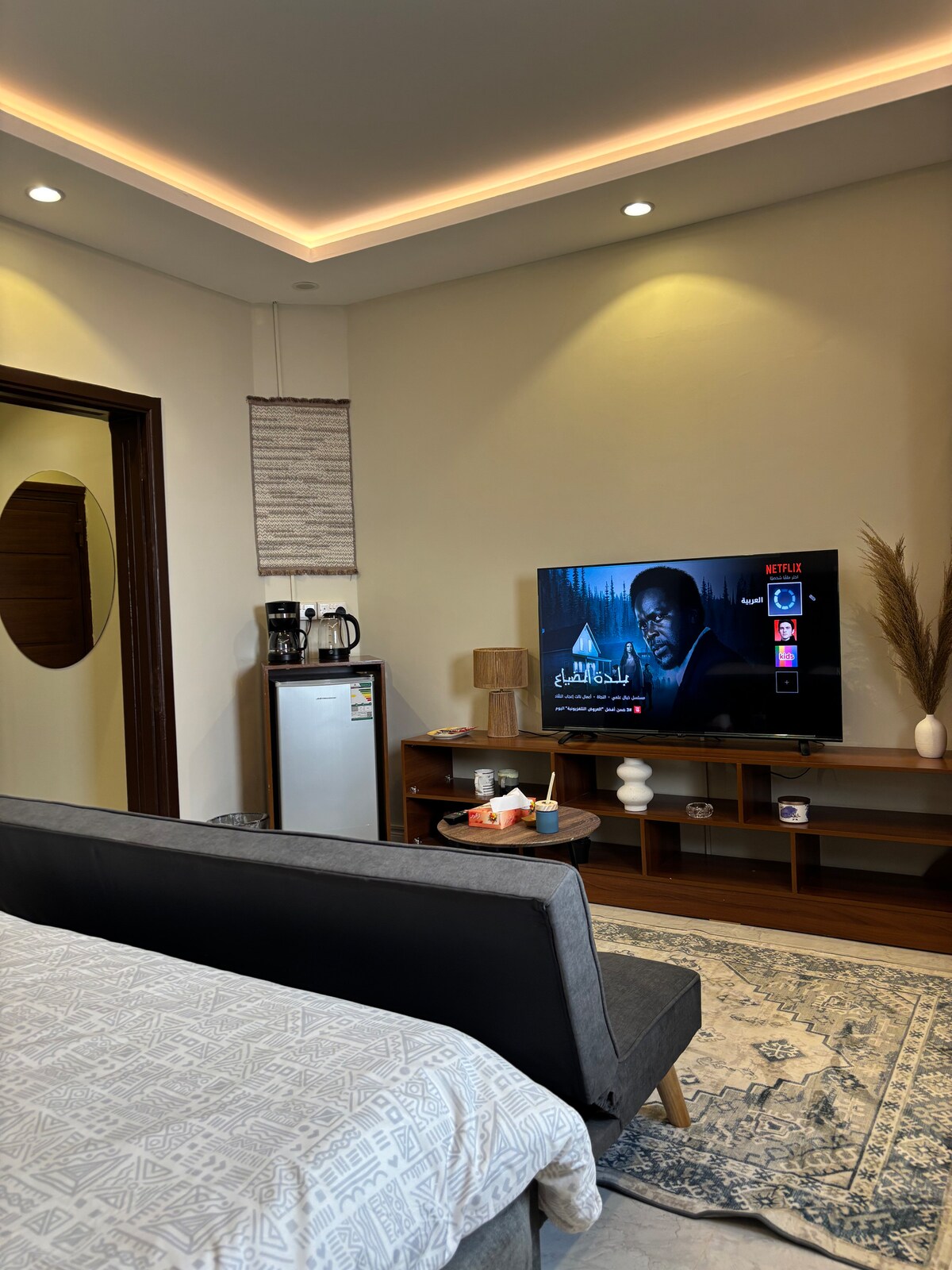 Dobrodošli v boemskem studiu 🌿 Uživajte v elegantnem boemskem garsonjerju, ki združuje toplino, preprostost in tihe umetniške detajle, skrbno zasnovane za vas. Studio se nahaja na živahni lokaciji na poslovni ulici in eni najpomembnejših ulic v Tabuku z enostavnim dostopom in parkiriščem pred nastanitvijo. Značilnosti garsonjere: 🪴 Topel boemski dizajn z naravnimi detajli in umirjenimi barvami • 🛏️ udobno, skrbno izbrano pohištvo za udobje gostov, Pametni televizor z naročninami na storitve Shahid, Netflix in YouTube Premium • 🧼 Visoka čistoča in pozornost do detajlov Vsak kotiček studia je zasnovan tako, da vam omogoča mirno in drugačno bivanje,