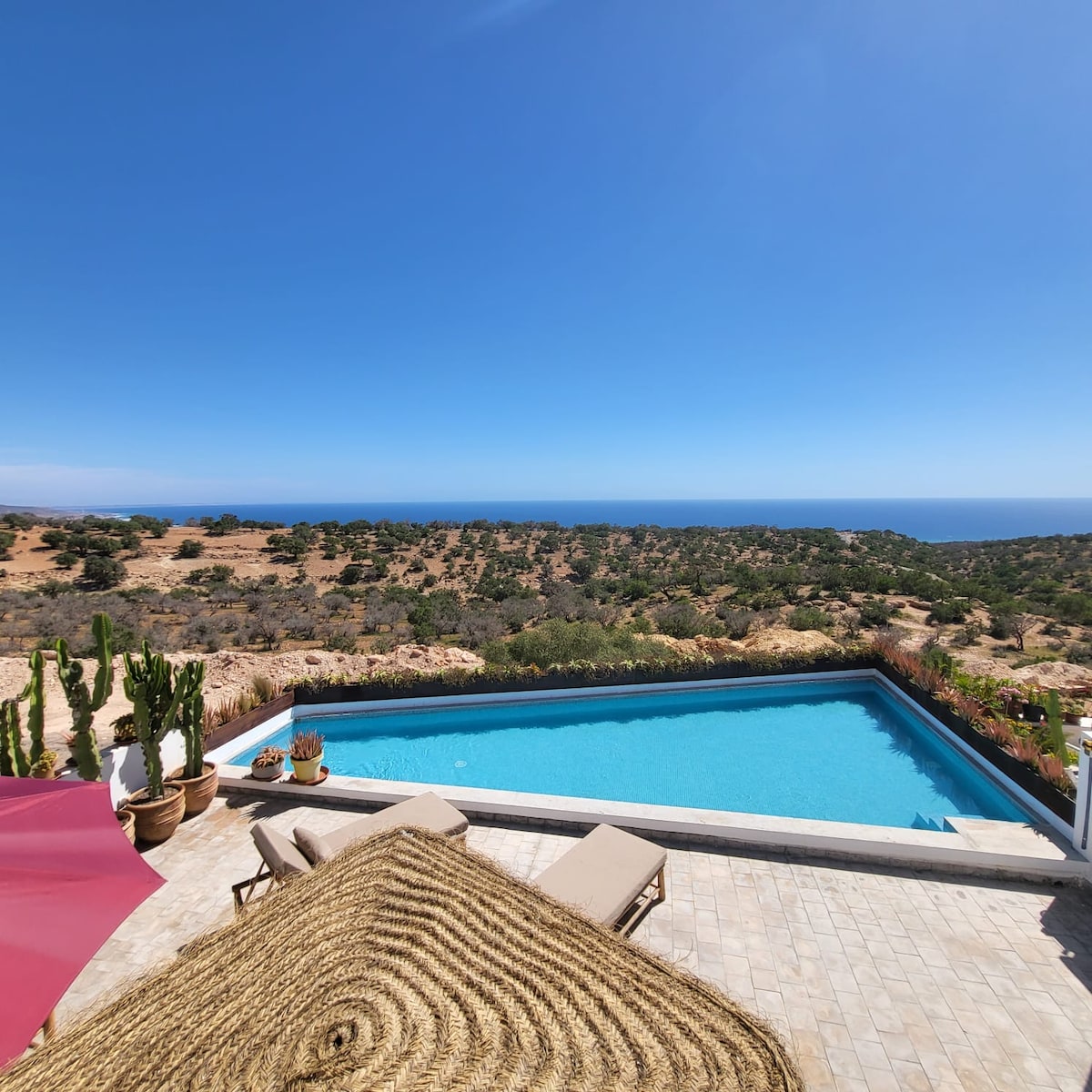Razkošno stanovanje s panoramskim razgledom na Atlantski ocean v osrčju Taghazouta. Edinstvena in prefinjena hiša, s pozornostjo do podrobnosti, od finih materialov do oblikovalskega pohištva. Hiša ima 4 spalnice, dve z zakonskimi posteljami, eno s kopalnico, spalnico z dvema enojnima posteljama in prostorno enoposteljno sobo. Velika dnevna soba z okni s pogledom na ocean, opremljena kuhinja s pogledom na morje in terasa s kavči, jedilno mizo in žarom. Hotelska storitev na zahtevo.