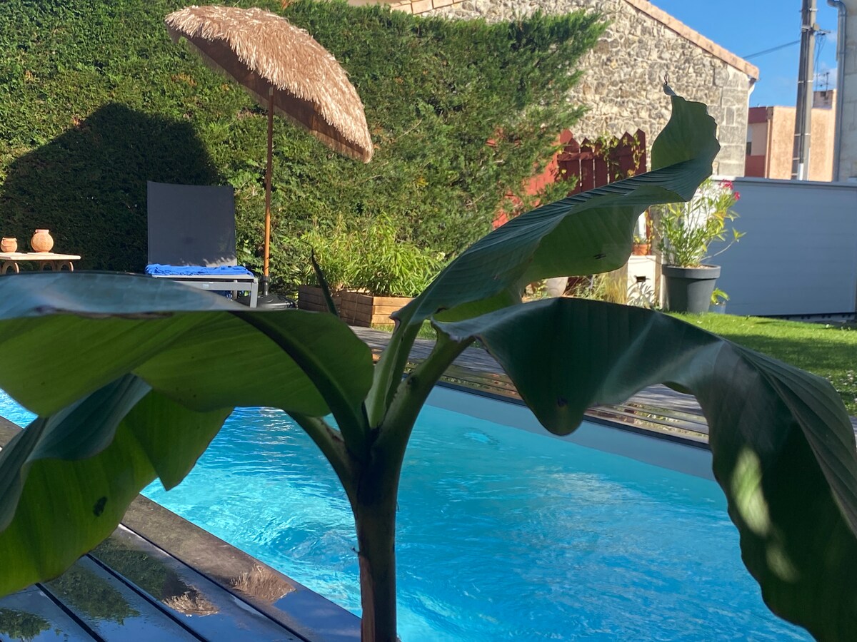 📲Posvetujte se z mano prek SMS-a za JULIJ 2026 (na voljo pod pogoji 3/07-3/08) 🏡50 m2 s klimatsko napravo + mestni bazen🏊♀️ (na zemljišču lastnikov), velika sončna terasa 😎 🍹in eksotični vrt🌺 🌵. Dobro opremljen in se nahaja. 🫧Pralnica < 5 min 🚊<10 min 🚍<5 min🥖🥩🥘🍒< 5 min 🌊🏖️< 50 min 🍇🏰< 20 min 🅿️ ulica 🧑🧑🧒🧒Idealno za pare in otroke 🐈⬛ na lokaciji 🥰 Turistični dokumenti🗺️, igre 🎱 in 📚