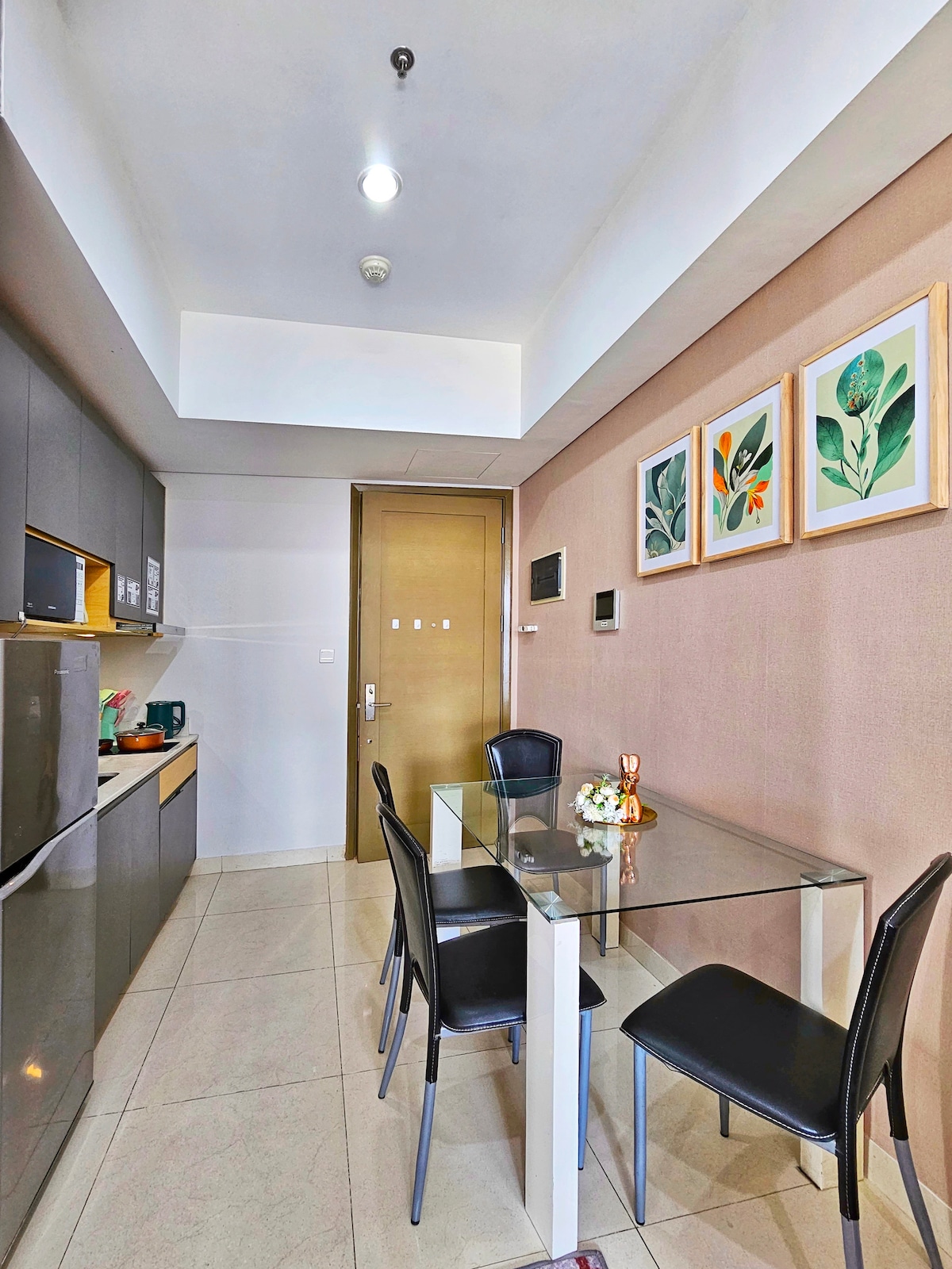 Popolnoma novo sodobno stanovanje v studiu s 50-palčnim Samsung Smart TV Crystal 4K UHD. Nahaja se v ulici Tower Fragrant, ki je povezan z nakupovalnim središčem Hublife&Taman Anggrek. -Brezplačni Netflix - brezplačen Wi-Fi, -Brezplačna mineralna voda - Dozirnik -Električni štedilnik -Mini hladilnik - Mikrovalovna pečica - sušilnik za lase -Bodywash - delovna miza Znamenitosti v bližini: 5 minut do nakupovalnega središča Central Park Mall, nakupovalnega središča Neo Soho in 10 minut do nakupovalnega središča Ciputra. 20 minut do letališča.
