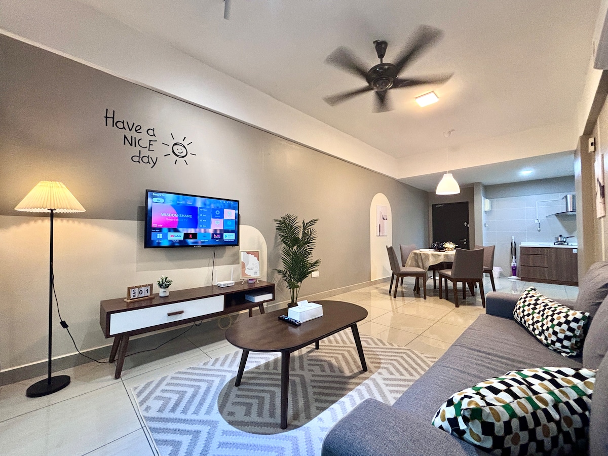 *NEW* DM me the word "New package" to enjoy 8% cashback. Escape to our stylish 2BR condo on the 33rd floor in Johor Bahru. This modern minimalist retreat offers stunning city skyline views and comfortably sleeps 6-7. Perfect for families or business travelers, it features an HD projector with Netflix, high-speed 5G Wi-Fi, and a well-equipped kitchen. Enjoy a unique urban getaway with resort-style amenities.