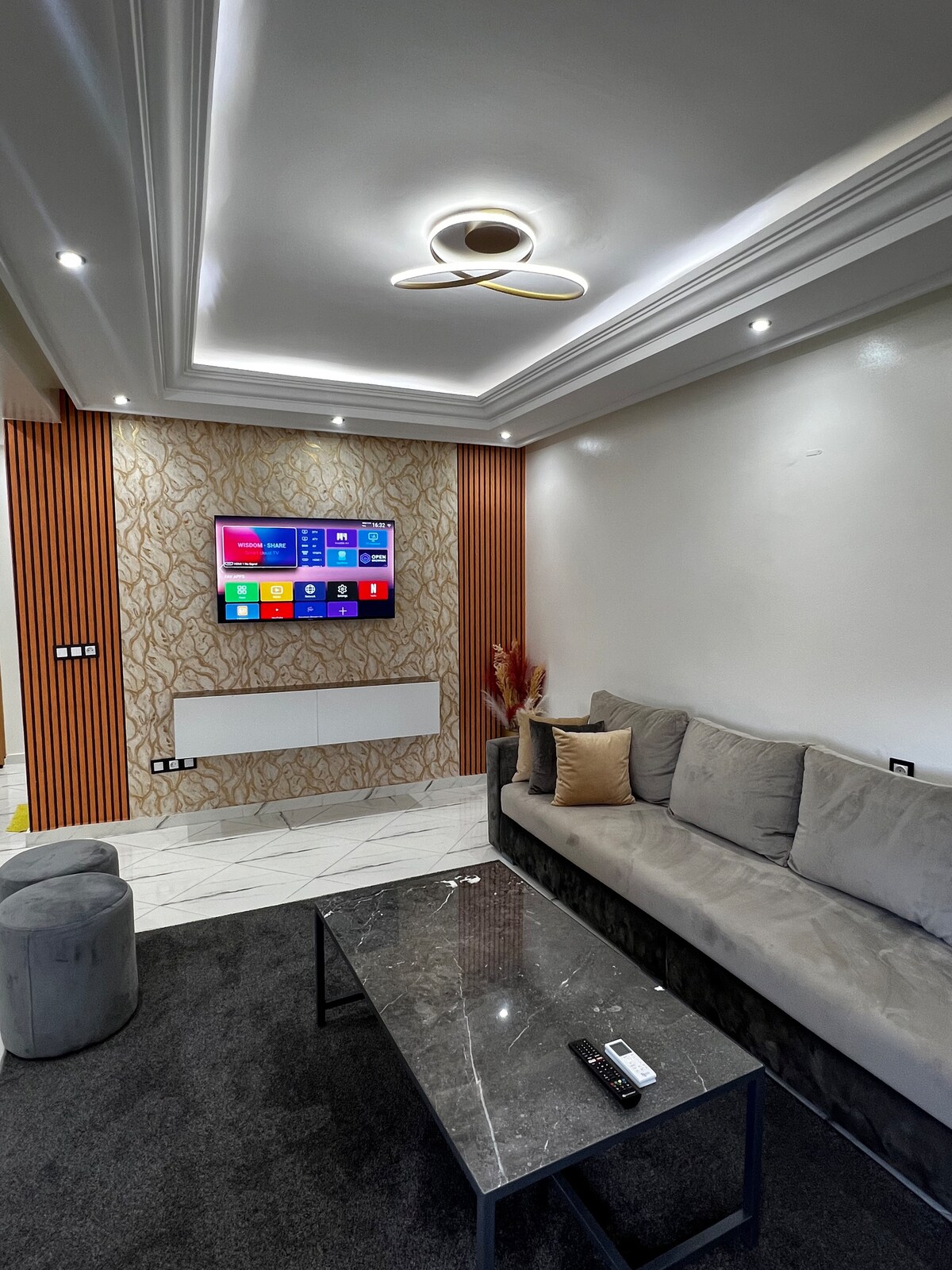 Stanovanje je sestavljeno iz 2 spalnic v bližini vseh znamenitosti in opreme. - 3 minute hoje od plaže. - 1 minuto hoje od korniša. -10 min hoje do postaje TGV in nakupovalnega središča City Mall Tangier. - Stavba je varna non stop(kamera na vhodu in hišni upravitelj) . - Brezplačno parkiranje je na voljo na kraju samem. - Bazen pred stavbo je oddaljen 5 minut hoje. - Bazen je odprt julija in avgusta. - Bazen je dostopen vsem. Brezplačno plavanje za 4 osebe, nato pa 40 DH/dodatne osebe.