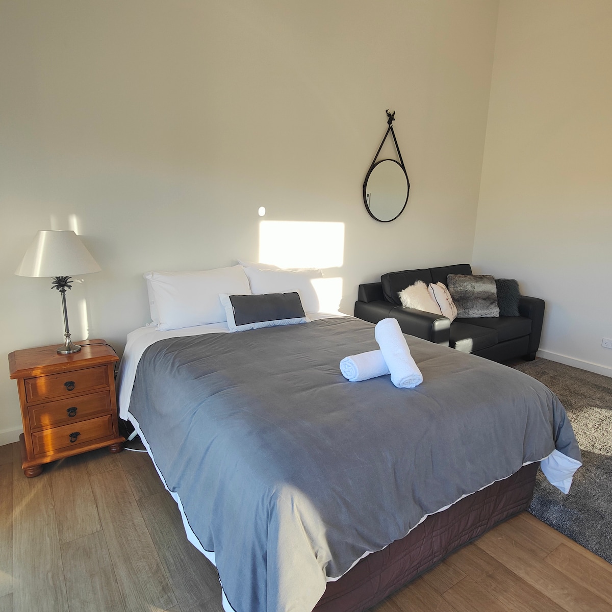 Laurie and Heather are delighted to welcome you to our home with a spacious guest suite. There is a kitchenette, en suite and studio room, 2 seater couch, laptop work area and private entrance. Double glazed and central heating. All on one level with level entry shower it caters for a wide range of guests. So close to town, lake, cafes and restaurants, your car might not move until you leave.