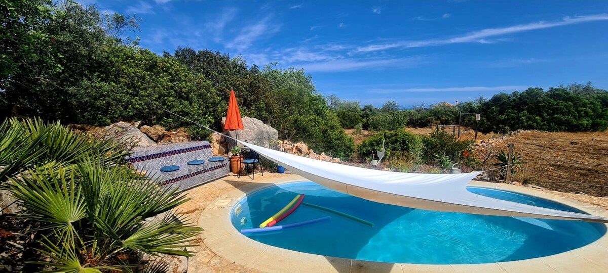 Naša majhna hiša za goste se nahaja sredi narave na skupnem posestvu 1 hektar v zaledju Algarve, 5 km od Atlantskega oceana, ki ga lahko vidite iz bazena, ki je 100 m od hiše na vrtu. Hišo za goste smo zgradili sami. Ima dve veliki spalnici s kamnitimi in lesenimi tlemi, okna in mozaike Tiffani ter skupno kopalnico s prho/straniščem. Postelje imajo 160 cm, 140 cm in 90 cm. Kuhinjski in jedilni prostor se nahajata na pokriti terasi.