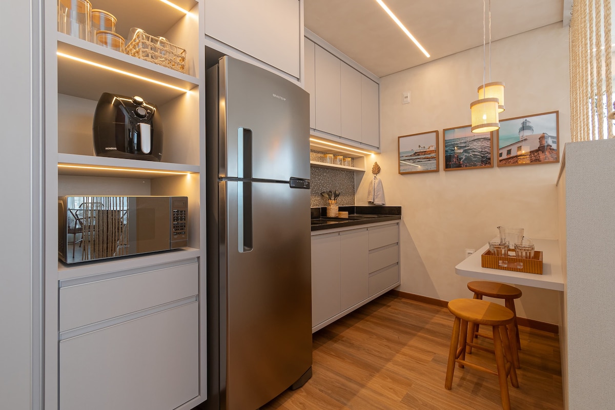 Dobrodošli v butiku Bahia, kjer se razkošje sreča z spokojnostjo valov in šarmom zgodovinskega okrožja Barra. To stanovanje je bilo skrbno zasnovano, navdihnjeno z zasnovo butičnih hotelov, z udobnim pohištvom in barvno paleto, ki odraža spokojnost oceana, ki zagotavlja prijetno in prefinjeno okolje. Občutite morski vetrič in uživajte v bahianskem soncu ter se vsako jutro zbudite ob osupljivem pogledu na morje. Počutite se kot doma in »Sorria, você está na Bahia!«
