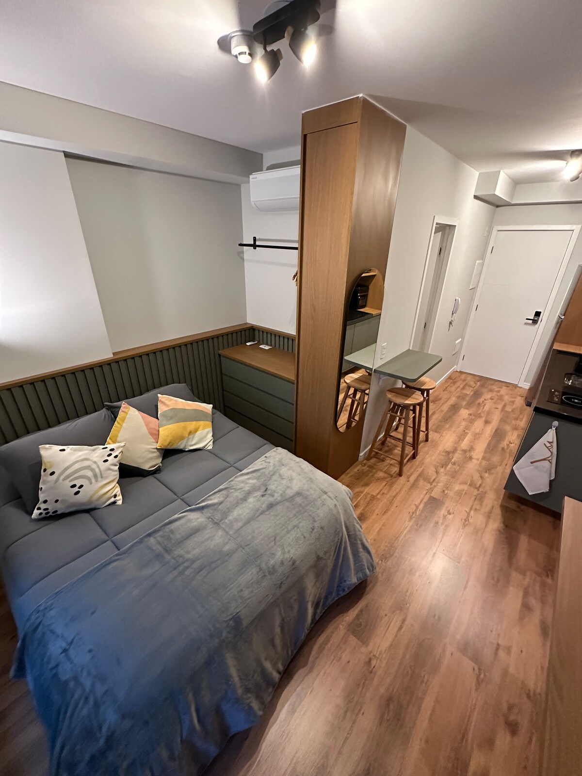 Sodobna garsonjera s klasičnim pohištvom, dobro urejena, udobna, zelo dobra lokacija in s klimatsko napravo! Samostojni vstop. Pred postajo podzemne železnice v Brooklynu (samo prečkajte ulico), poleg trgovin Morumbi Shopping, Carrefour, Sugarloaf, Bakeries, Restaurants. Vse lahko storite peš!! Balkon je zaprt. TV, Netflix, Wi-Fi, balkon, zatemnitev v zavesah in zasebni pralni stroj. Ne sprejemamo kadilcev in hišnih ljubljenčkov