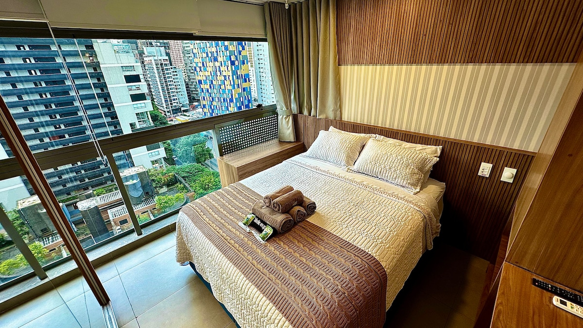 Confortável c serviços, recepção 24hs, piscina, sauna, academia, estacionamento grátis, ótimo wifi, ar-condicionado, Tv c Tv a Cabo e FireTv, varanda c vista, restaurante no térreo, também servem no apto, filtro de água, ao lado do metrô Faria Lima, pertinho do Shopping Iguatemi, Eldorado, USP, muitas opções de entretenimento, serviços, bares, gastronomia, vida noturna. Excelente custo-benefício e razões de sobra para adorar sua estadia em São Paulo a passeio, negócios ou estudos!