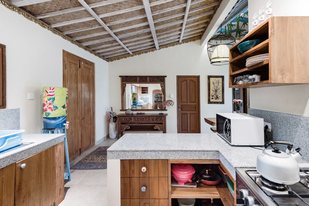 Lepa zasebna vila z bazenom velikosti 6x3 metrov. varna, zasebna,varna. bujen vrt in zaščitena, vendar odprta kuhinja za večerjo in sprostitev ob bazenu. zakonska postelja,kopalnica odprt tuš, popolnoma opremljena kuhinja. ac,tv, velik Wi-Fi, dnevno čiščenje in set zajtrk je vklj. v ljubki vasi Penestanan Kaja. Od centra Ubuda je oddaljen le 2 km.