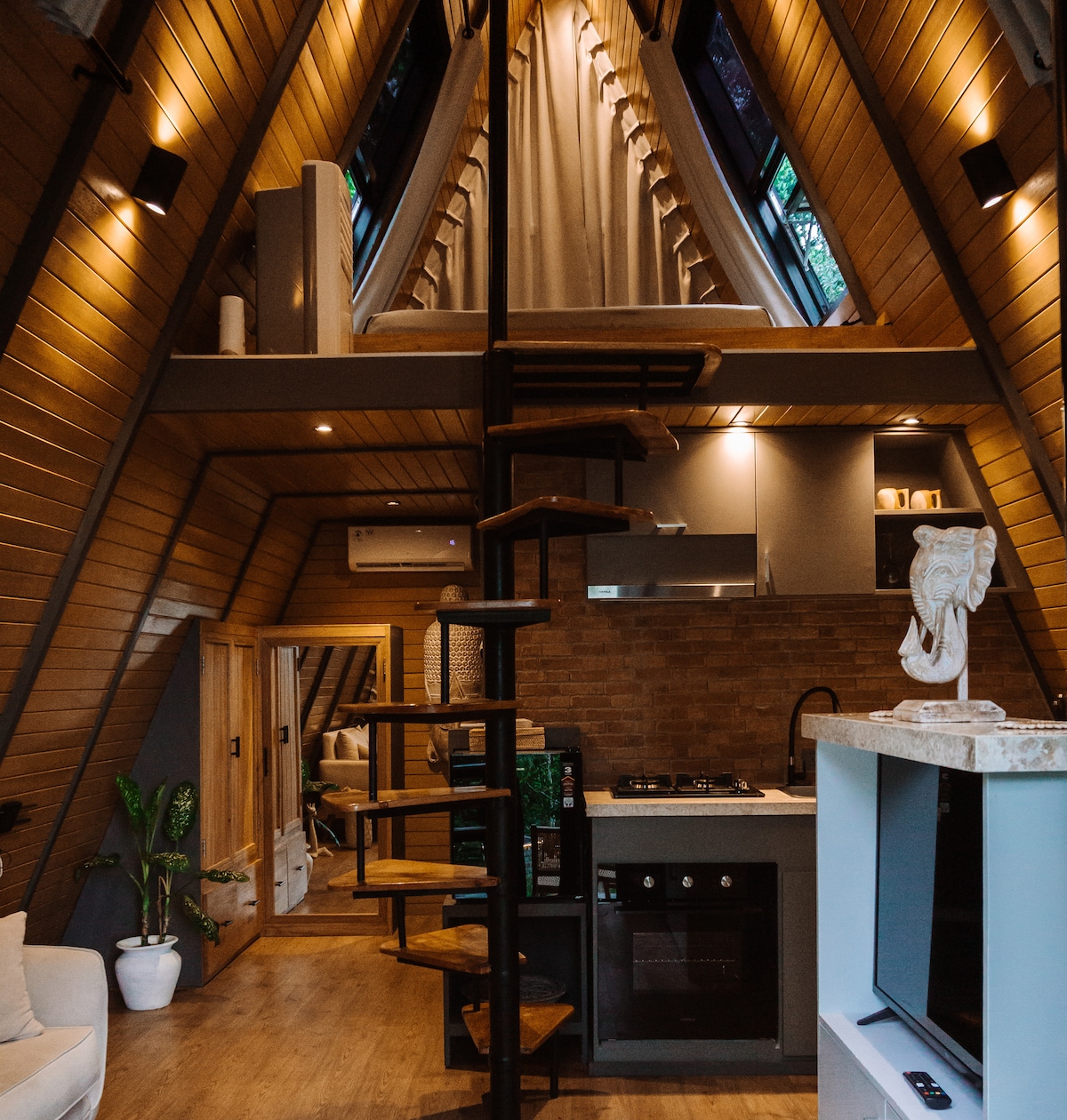 Pobegnite v našo edinstveno majhno vilo v obliki črke A, ki se nahaja v mirnih džunglah Ubuda. To zatočišče, ki združuje sodobno razkošje in naravo, je kot nalašč za miren oddih v dvoje. Uživajte na zasebni terasi ter imejte na voljo skupni gozdni bazen in prostor za taborni ogenj. V notranjosti boste našli udoben bivalni prostor, namenski delovni prostor, popolnoma opremljeno kuhinjsko nišo in pametno televizijo z Netflixom.