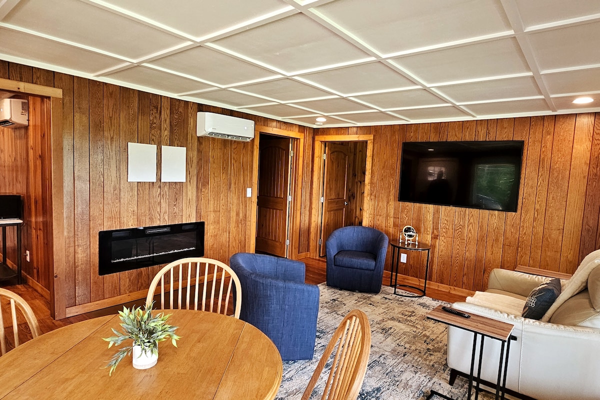 Ta sodobna brunarica je velika garsonjera z vsemi »zvonovi in piščalkami« !!! Na voljo je zelo pomembna zakonska postelja, čudovita gorska dekoracija, zložljiv kavč, stoli Adirondack za verando in staromodna gugalnica na verandi. Kuhinja z vso opremo, ena kopalnica, 65-palčni pametni televizor s hitrim omrežjem Wi-Fi. V gozdu z VELIKO masažno kadjo je to kot nalašč za praznovanje ali medene tedne. Pridite s prijatelji. Ali pa bodite sebični in jo pripeljite samo zato, da boste skupaj. Lahko bi pripeljali tudi kužka.