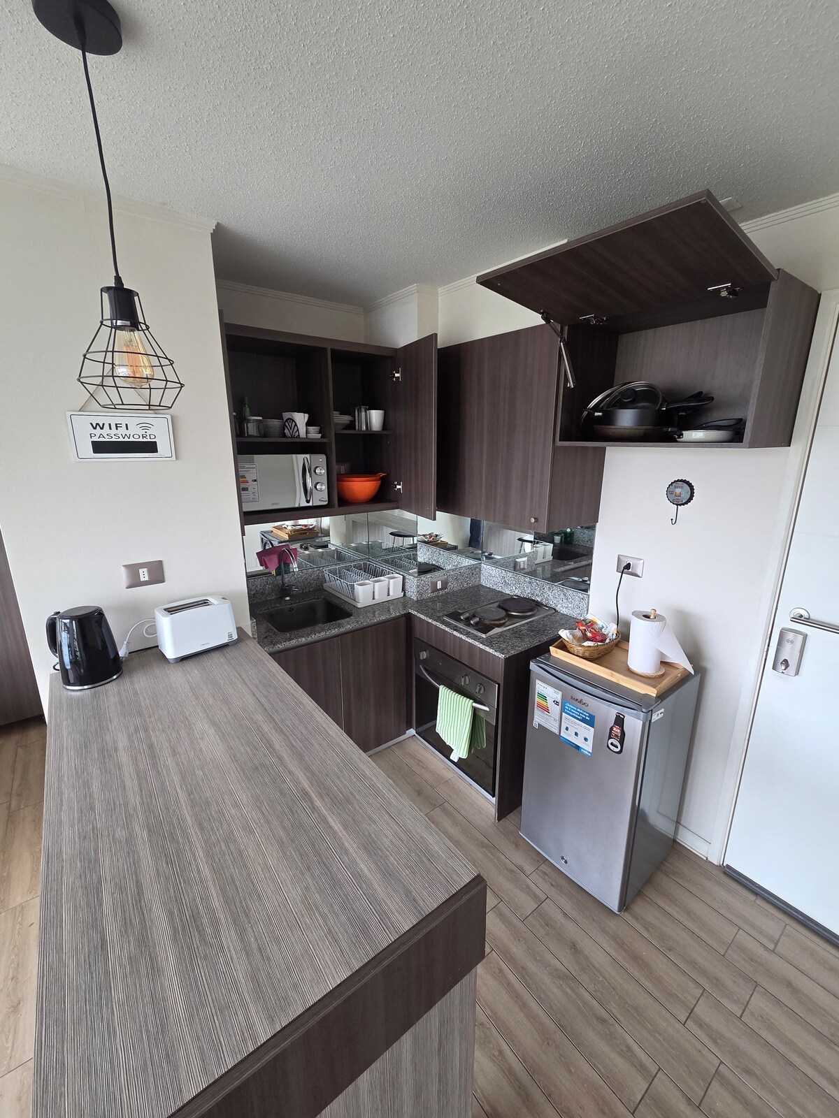Novo in udobno stanovanje v garsonjeri za poslovneže, minimalističnega starinskega sloga, udobno za dve osebi; le nekaj korakov od Strip Centra s supermarketom, lekarno, trgovino in restavracijami, v bližini Clínice, več univerz in trga Plaza Dreves. UFRO 15 min U Catolica 10min Nove naprave iz linije Ursus Trotter. Postelja, posteljnina in brisače iz linije Rosen. Mirno stanovanje, idealno za domačo pisarno. Privilegiran pogled iz 12. nadstropja VKLJUČUJE PARKIRANJE.