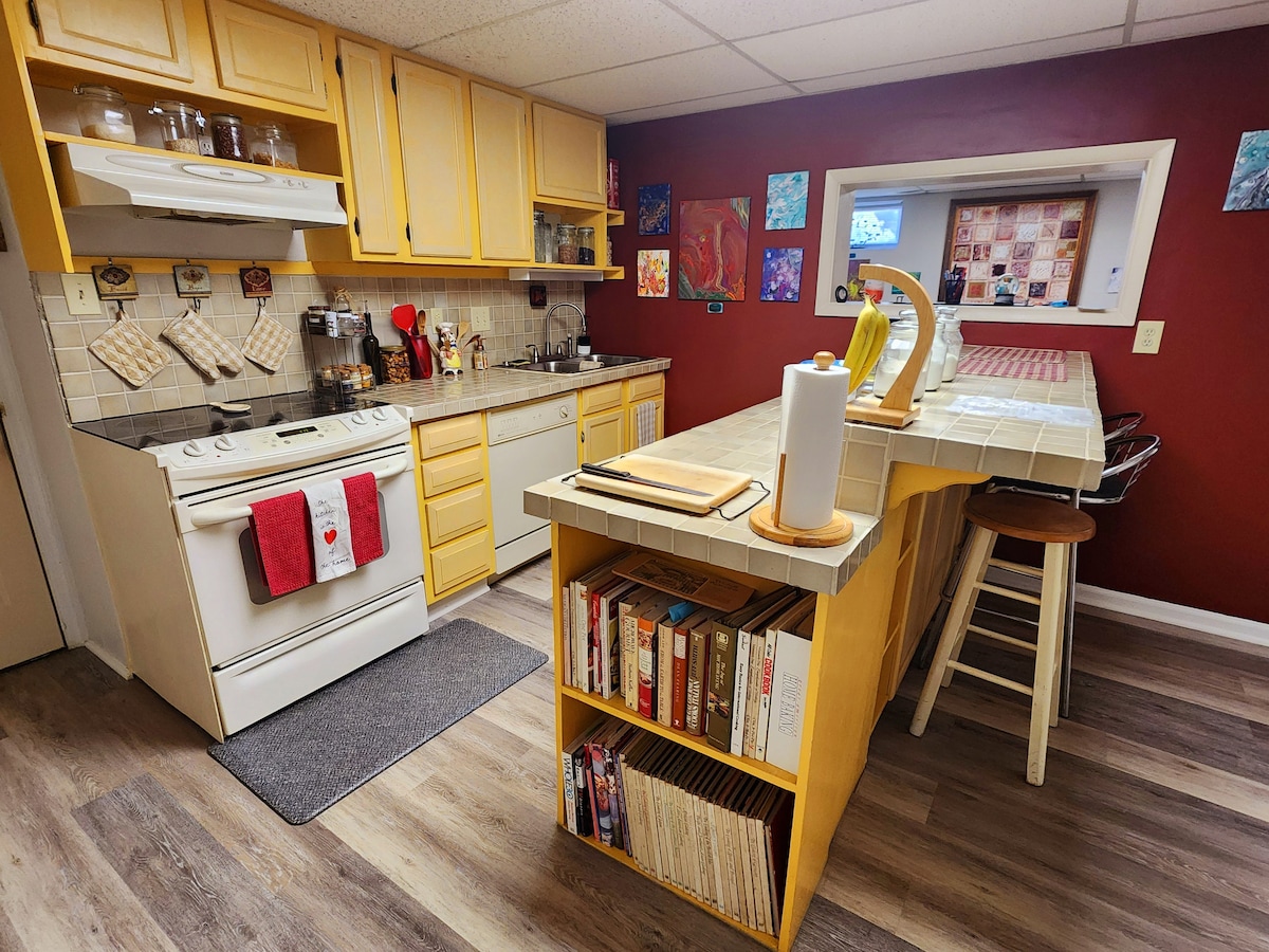 Prostorno kletno stanovanje z 2 spalnicama/1 kopalnico tik pred Leipers Forkom, večkot300kvadratnih metrov, kuhinjska niša, jedilnica, dnevna soba in pisarna. Velika zakonska postelja v glavni spalnici in dodatna postelja/soba v odprtem prostoru s tremi enojnimi posteljami. Idealno za družine. Namestitev ima sprehajalne poti, potoke in kamp z ognjiščem in mizo za piknik. Namestitev je opremljena tudi s potovalno posteljico in igralnico za otroke. Hišni ljubljenčki so dobrodošli, na voljo pa je tudi pesjak. Imamo vse, kar potrebujete.